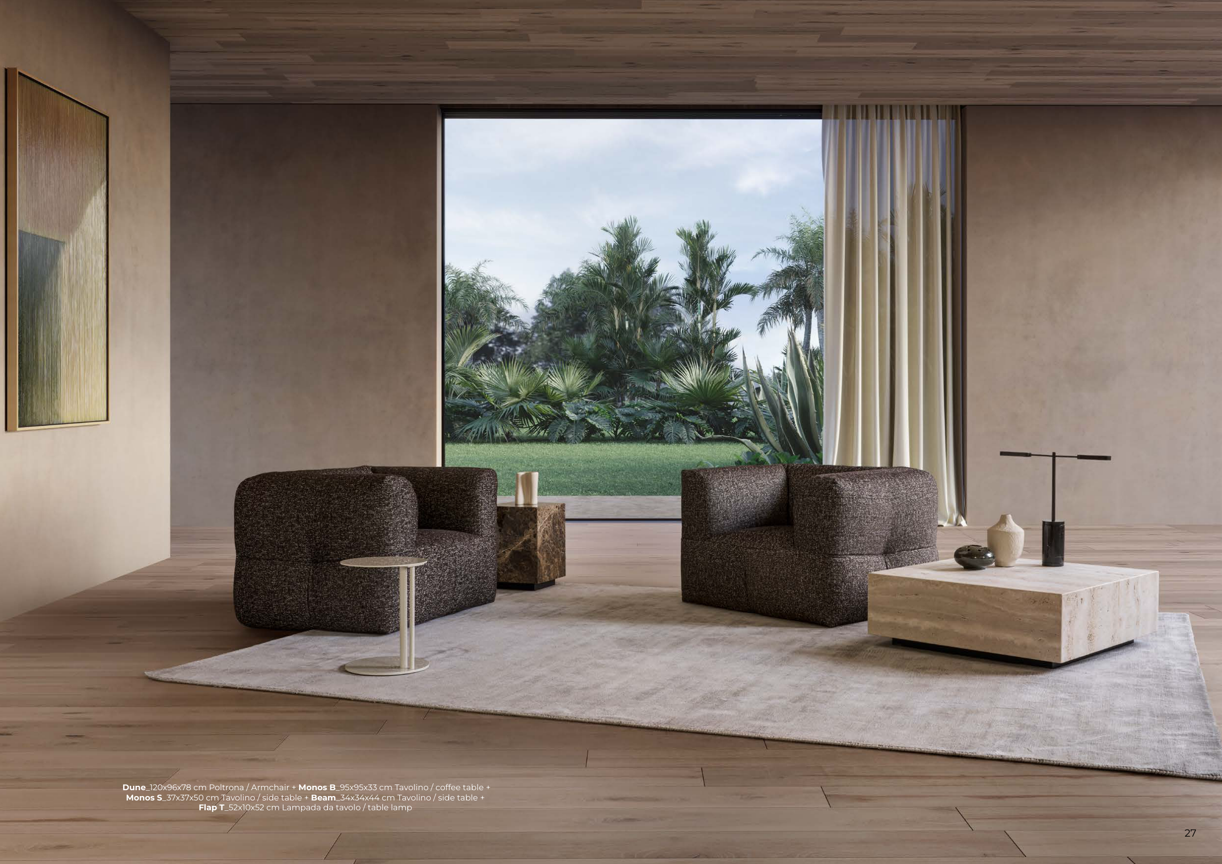 Dune_120x96x78 cm Poltrona / Armchair + Monos B_95x95x33 cm Tavolino / coffee table + Monos S_37x37x50 cm Tavolino / side table + Beam_34x34x44 cm Tavolino / side table + Flap T_52x10x52 cm Lampada da tavolo / table lamp 27