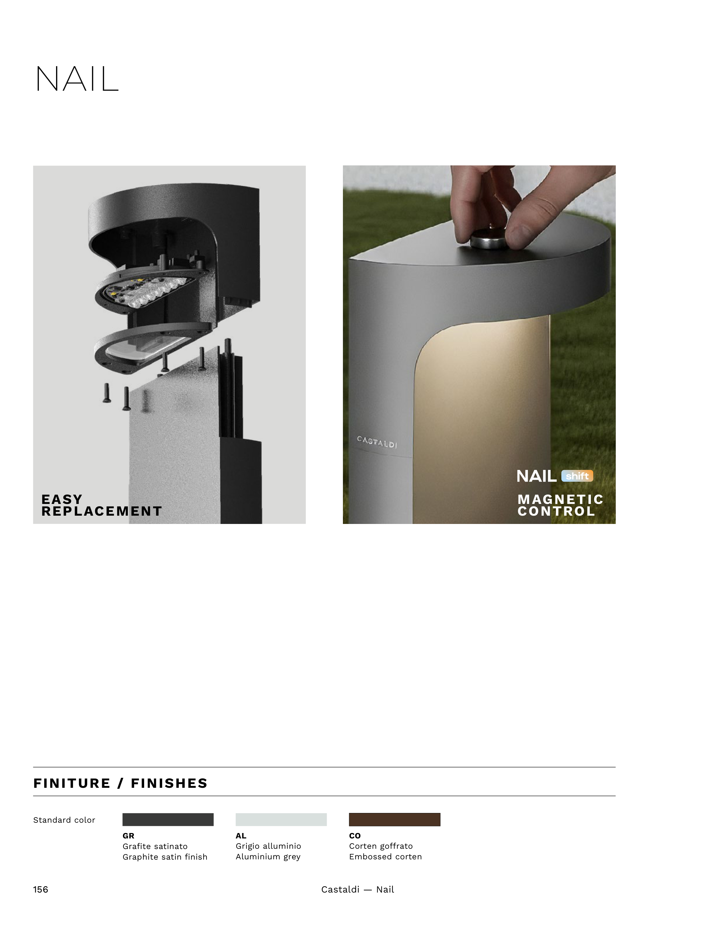 Castaldi — Nail 156 156 NAIL FINITURE / FINISHES AL Grigio alluminio Aluminium grey CO Corten goffrato Embossed corten GR Grafite satinato Graphite satin finish Standard color MAGNETIC CONTROL EASY REPLACEMENT