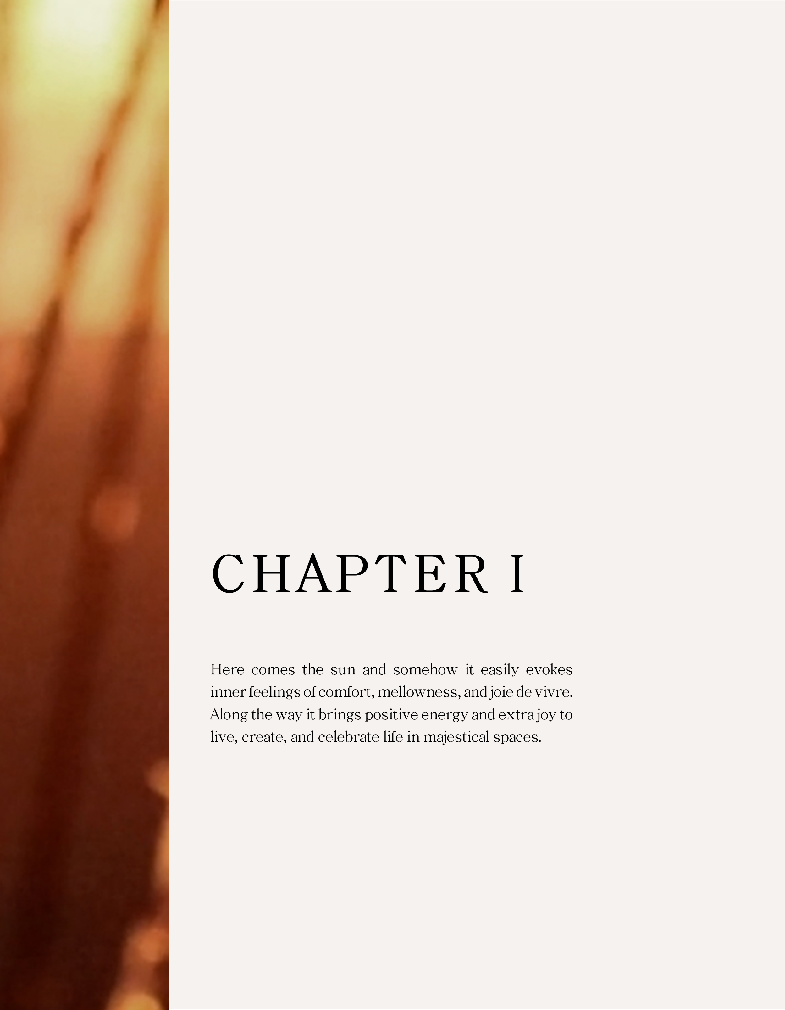 CHAPTER I SAFARI COLLECTION Here comes the sun and somehow it easily evokes inner feelings of comfort, mellowness, and joie de vivre. Along the way it brings positive energy and extra joy to live, create, and celebrate life in majestical spaces.