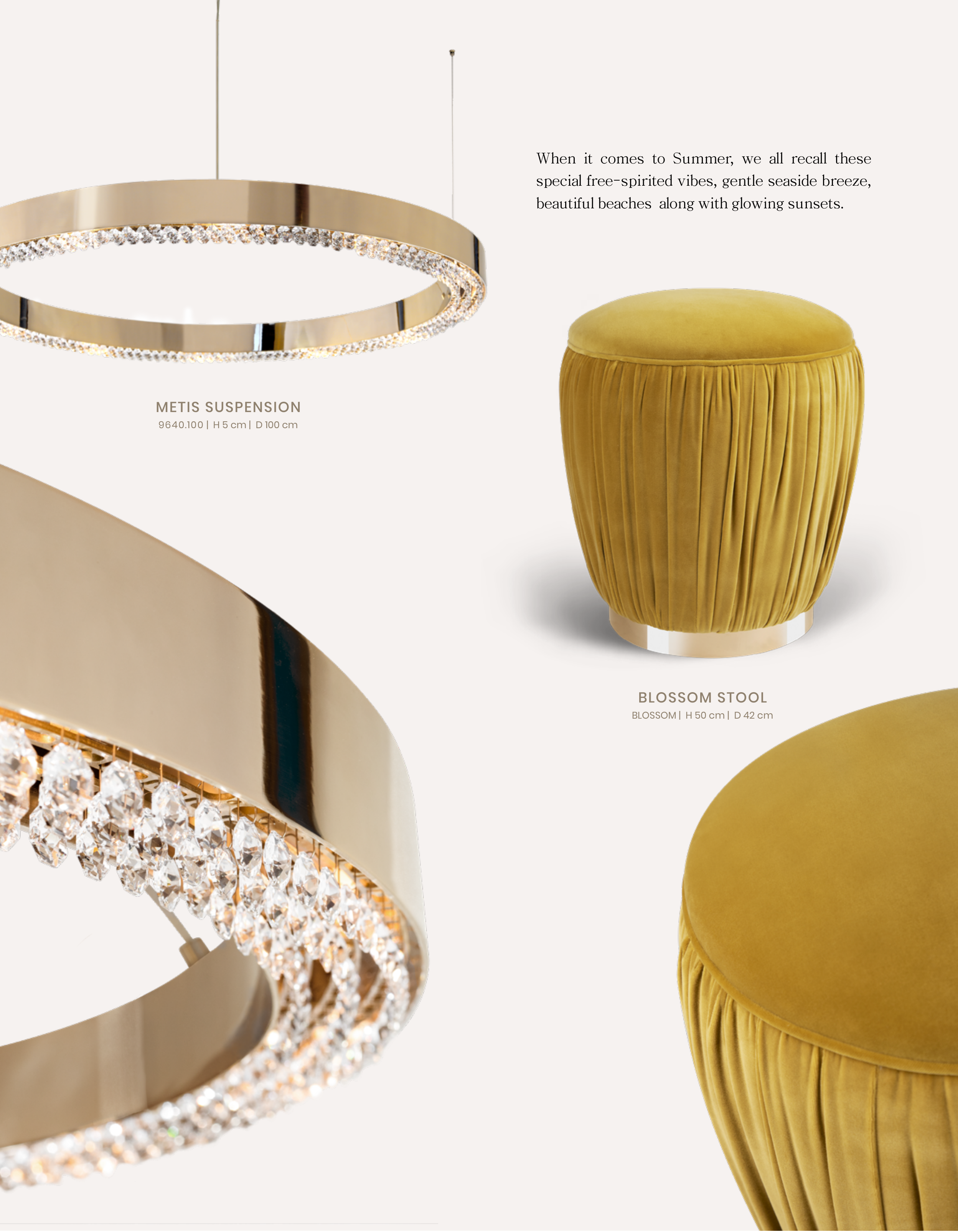 When it comes to Summer, we all recall these special free-spirited vibes, gentle seaside breeze, beautiful beaches along with glowing sunsets. BLOSSOM STOOL BLOSSOM | H 50 cm | D 42 cm METIS SUSPENSION 9640.100 | H 5 cm | D 100 cm