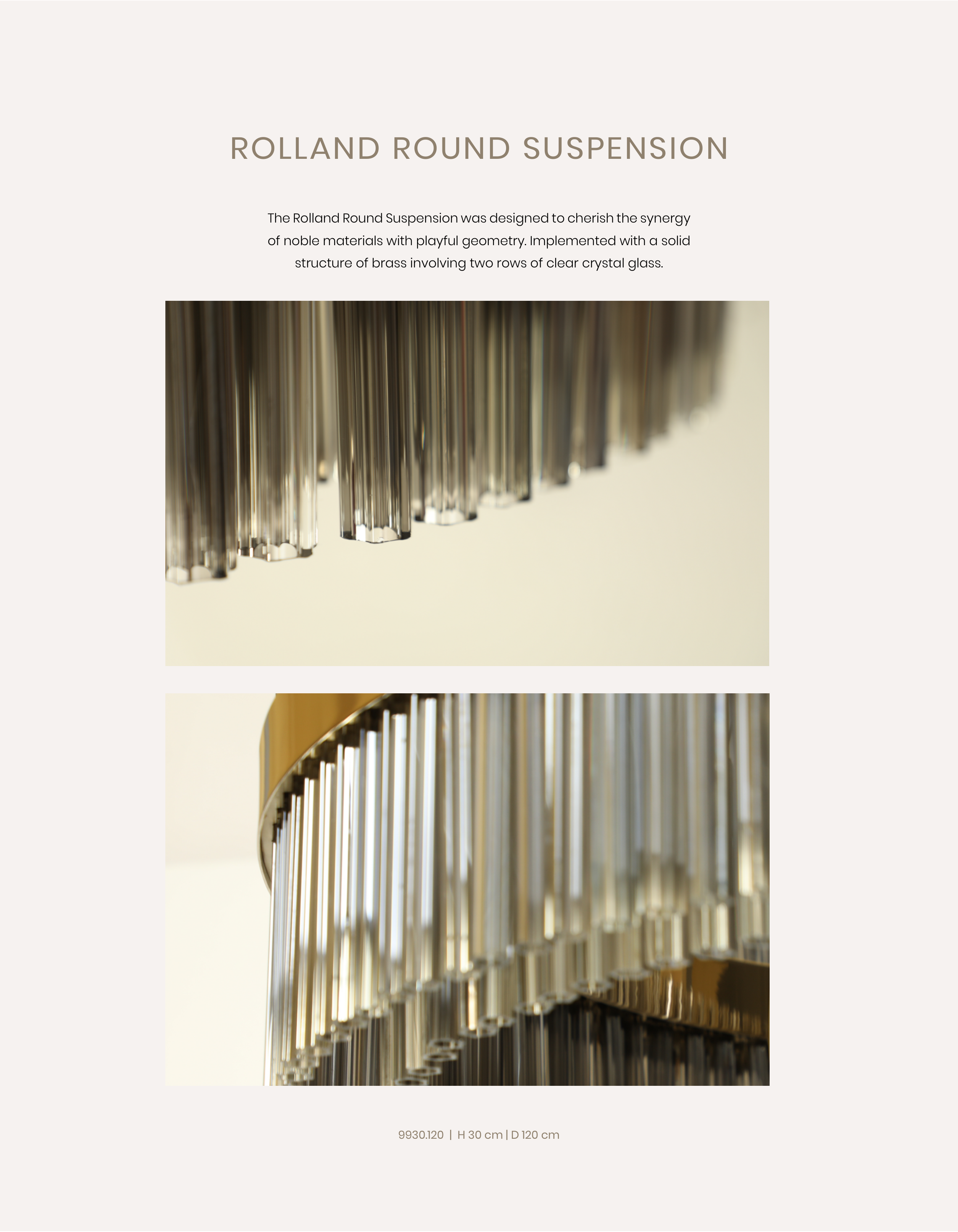 9930.120 | H 30 cm | D 120 cm The Rolland Round Suspension was designed to cherish the synergy of noble materials with playful geometry. Implemented with a solid structure of brass involving two rows of clear crystal glass.