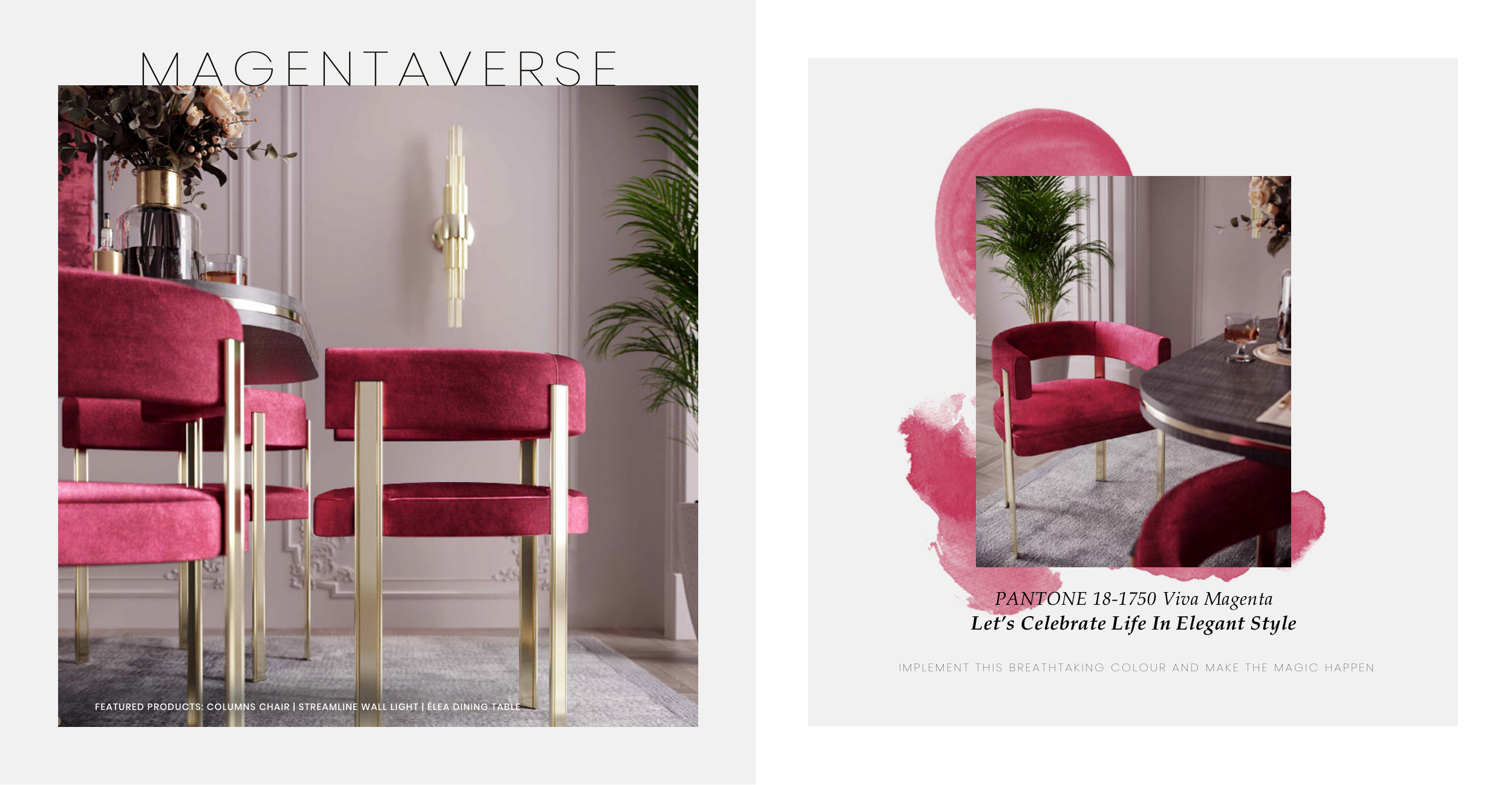 FEATURED PRODUCTS: COLUMNS CHAIR | STREAMLINE WALL LIGHT | ÉLEA DINING TABLE IMPLEMENT THIS BREATHTAKING COLOUR AND MAKE THE MAGIC HAPPEN PANTONE 18-1750 Viva Magenta Let’s Celebrate Life In Elegant Style