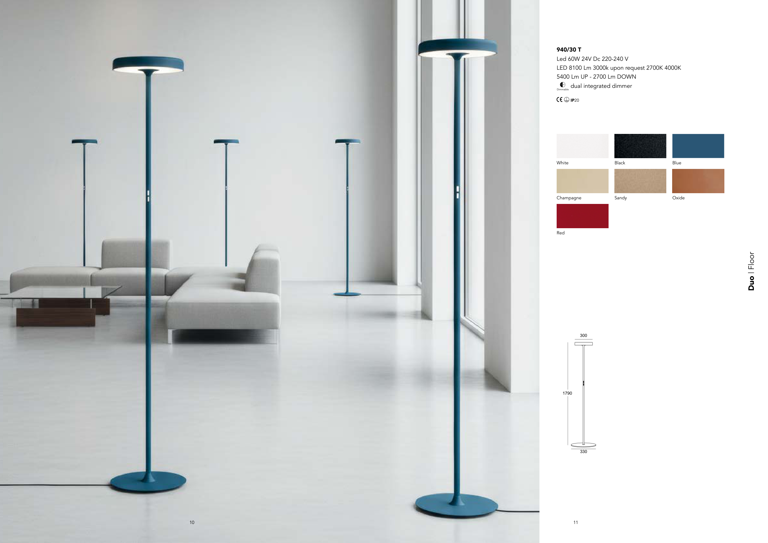 10 11 940/30 T Led 60W 24V Dc 220-240 V LED 8100 Lm 3000k upon request 2700K 4000K 5400 Lm UP - 2700 Lm DOWN Dimmable dual integrated dimmer IP20 300 1790 330 Blue White Black Oxide Champagne Red Sandy Duo | Floor