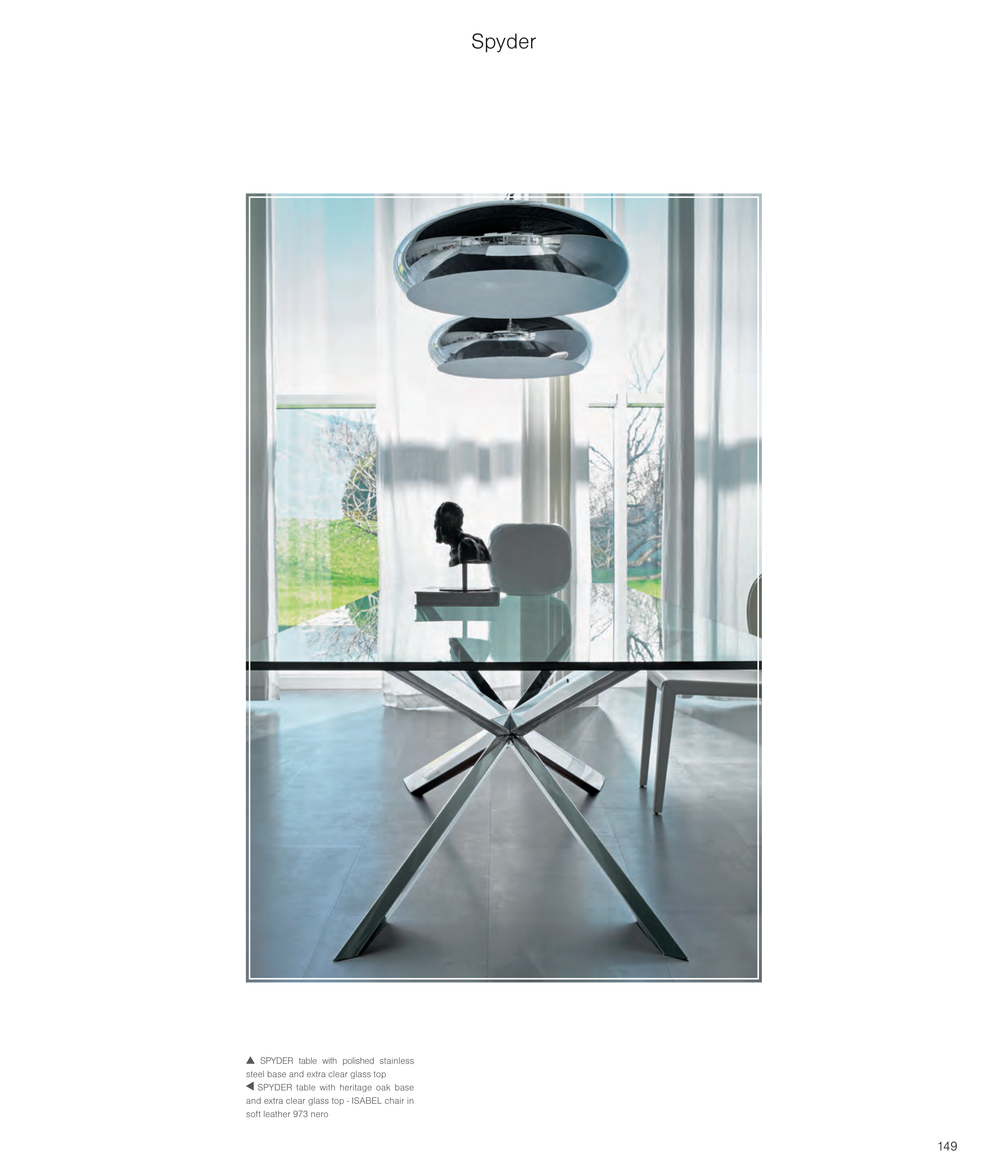 SPYDER table with polished stainless steel base and extra clear glass top SPYDER table with heritage oak base and extra clear glass top - ISABEL chair in soft leather 973 nero 149 Spyder