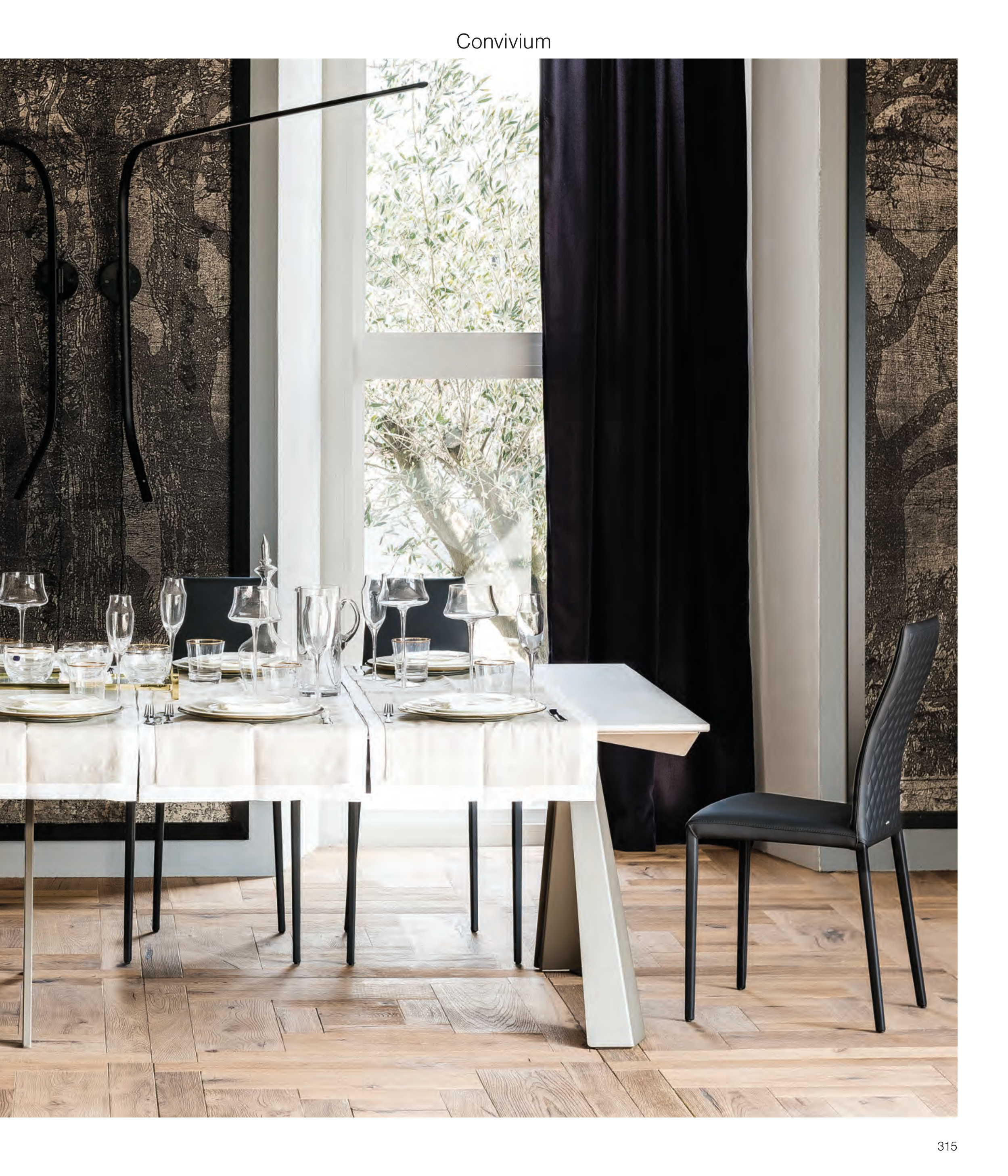 CONVIVIUM console with titanium base and cement laminated wood top - KAY COUTURE chairs in soft leather 956 atlantico - FISHERMAN lamps in black 315 Convivium