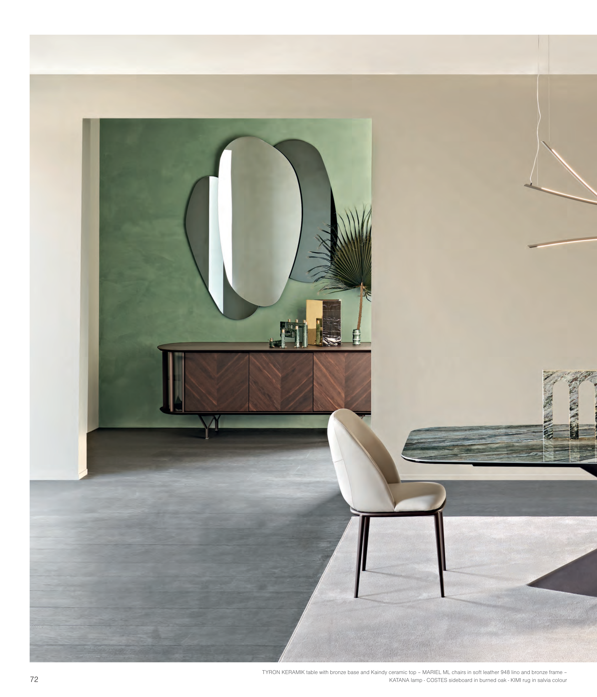 TYRON KERAMIK table with bronze base and Kaindy ceramic top – MARIEL ML chairs in soft leather 948 lino and bronze frame – KATANA lamp - COSTES sideboard in burned oak - KIMI rug in salvia colour 72 Tyron Keramik