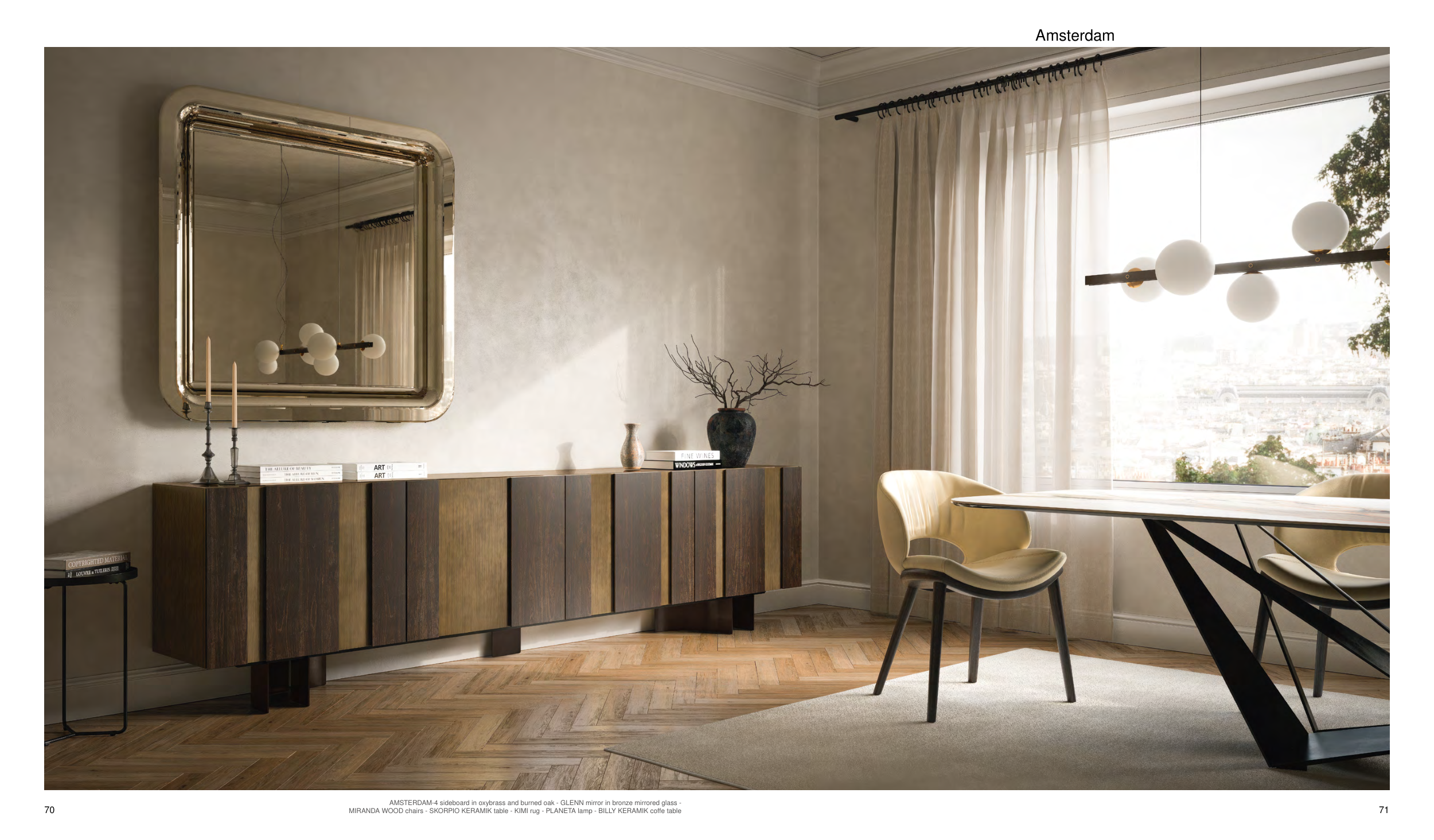 Amsterdam 71 70 AMSTERDAM-4 sideboard in oxybrass and burned oak - GLENN mirror in bronze mirrored glass - MIRANDA WOOD chairs - SKORPIO KERAMIK table - KIMI rug - PLANETA lamp - BILLY KERAMIK coffe table