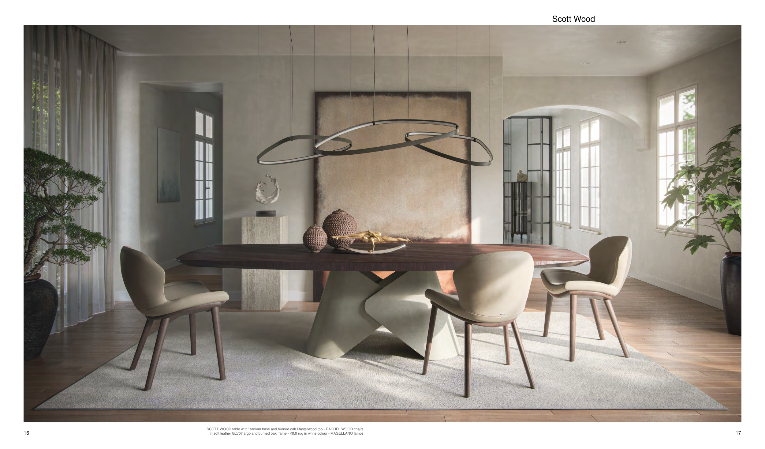 17 16 Scott Wood SCOTT WOOD table with titanium base and burned oak Masterwood top - RACHEL WOOD chairs in soft leather GLV07 argo and burned oak frame - KIMI rug in white colour - MAGELLANO lamps