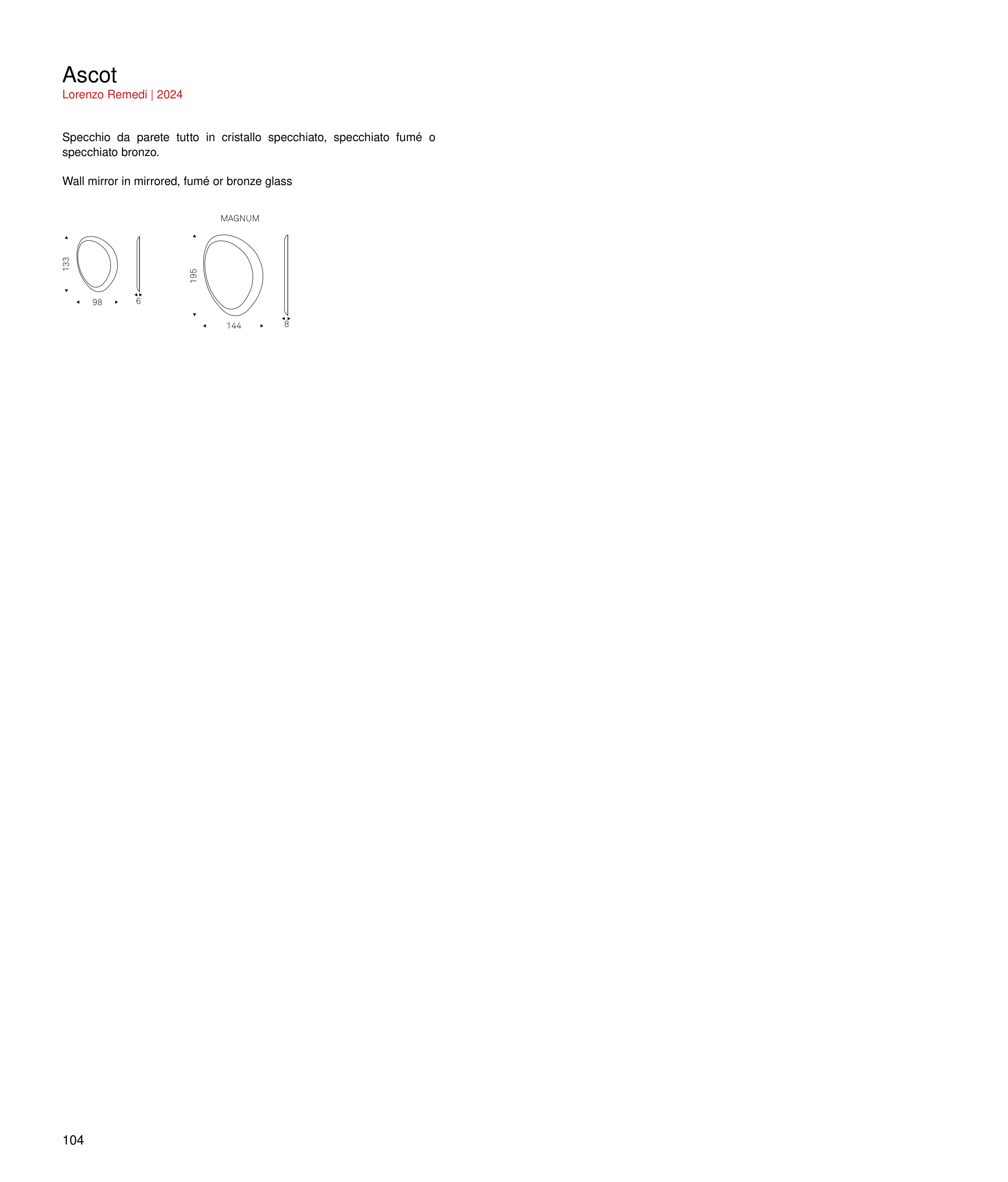 104 Ascot Lorenzo Remedi | 2024 Specchio da parete tutto in cristallo specchiato, specchiato fumé o specchiato bronzo. Wall mirror in mirrored, fumé or bronze glass 144 195 8 MAGNUM 133 98 6