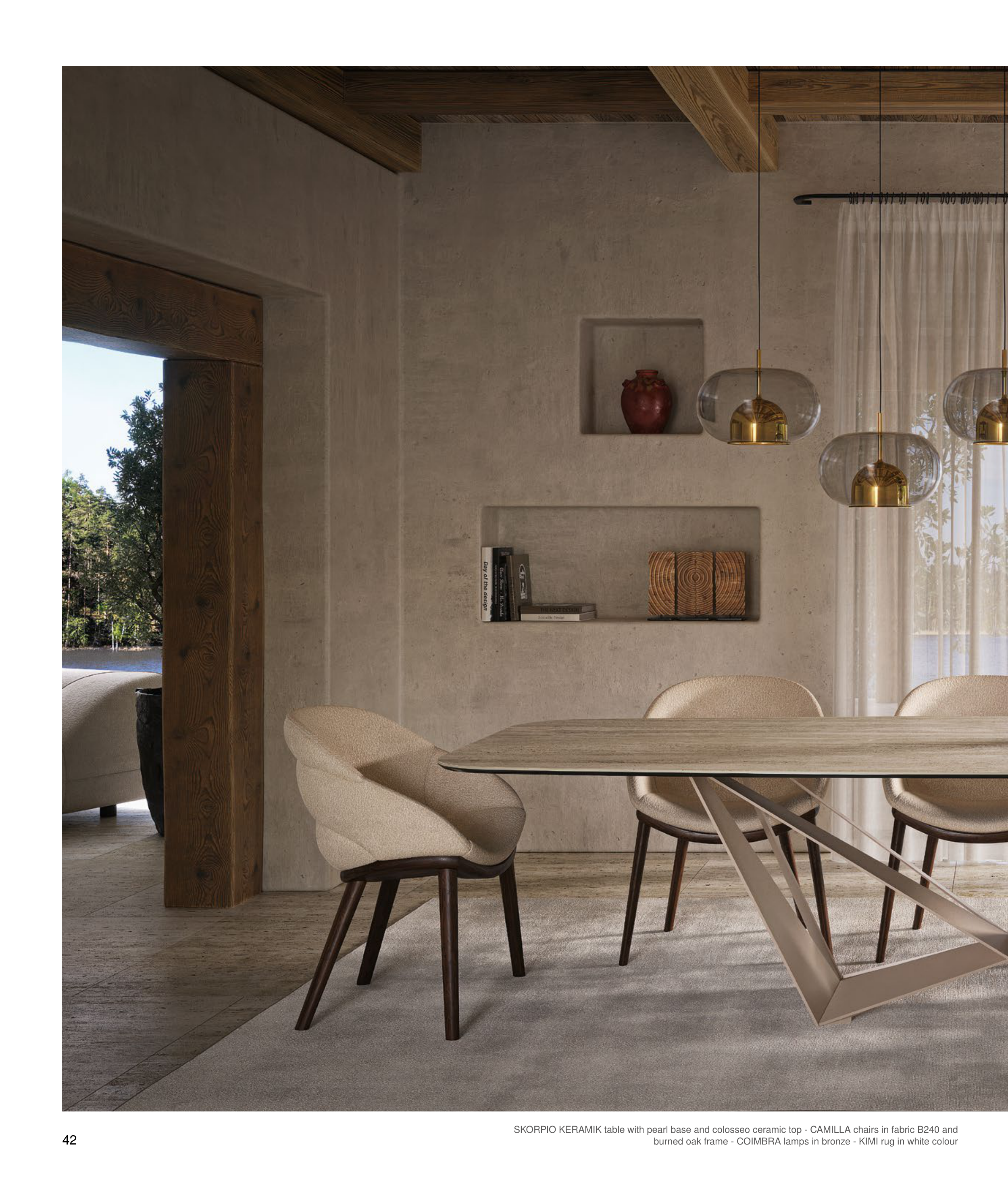 42 SKORPIO KERAMIK table with pearl base and colosseo ceramic top - CAMILLA chairs in fabric B240 and burned oak frame - COIMBRA lamps in bronze - KIMI rug in white colour