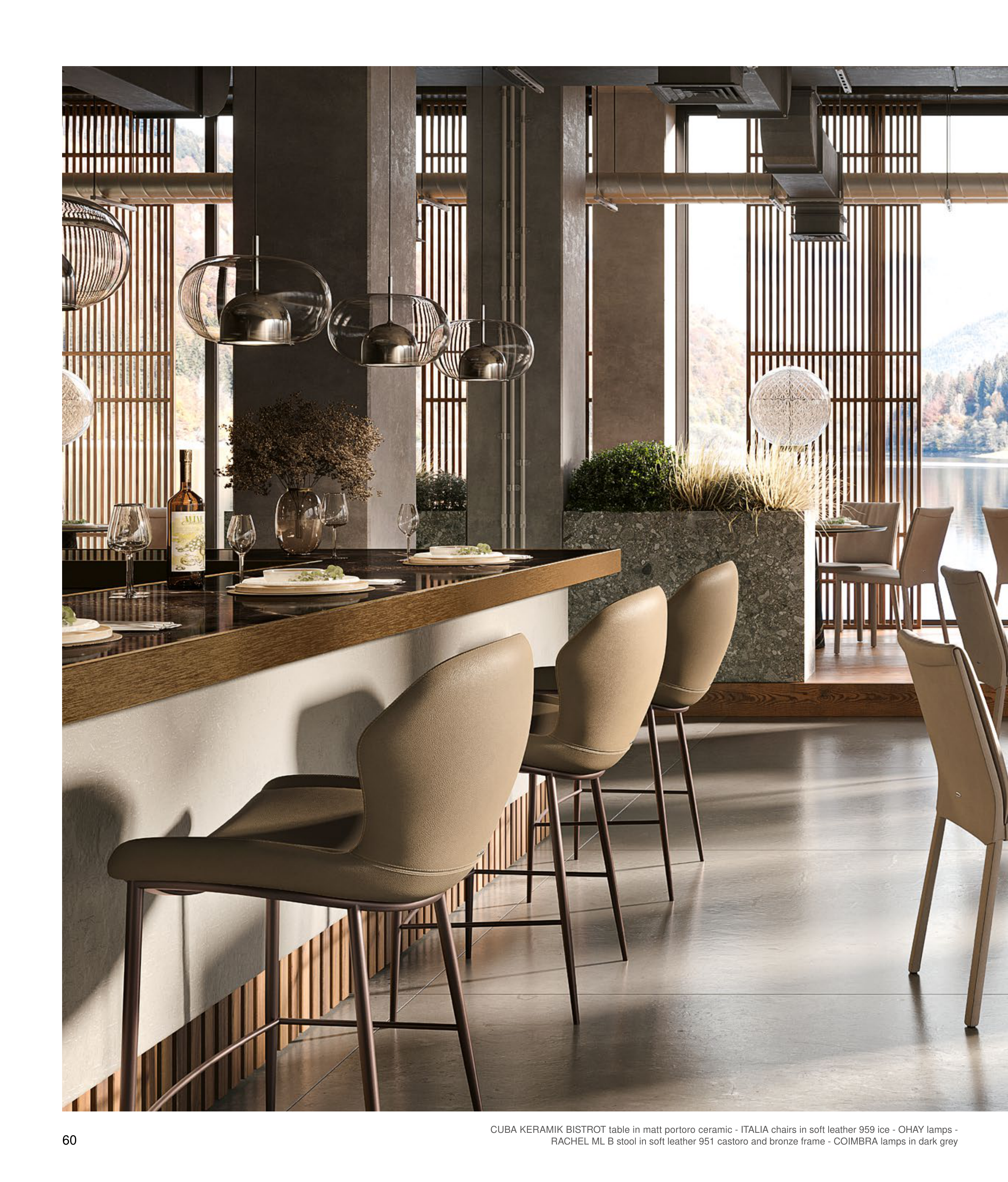 60 CUBA KERAMIK BISTROT table in matt portoro ceramic - ITALIA chairs in soft leather 959 ice - OHAY lamps - RACHEL ML B stool in soft leather 951 castoro and bronze frame - COIMBRA lamps in dark grey