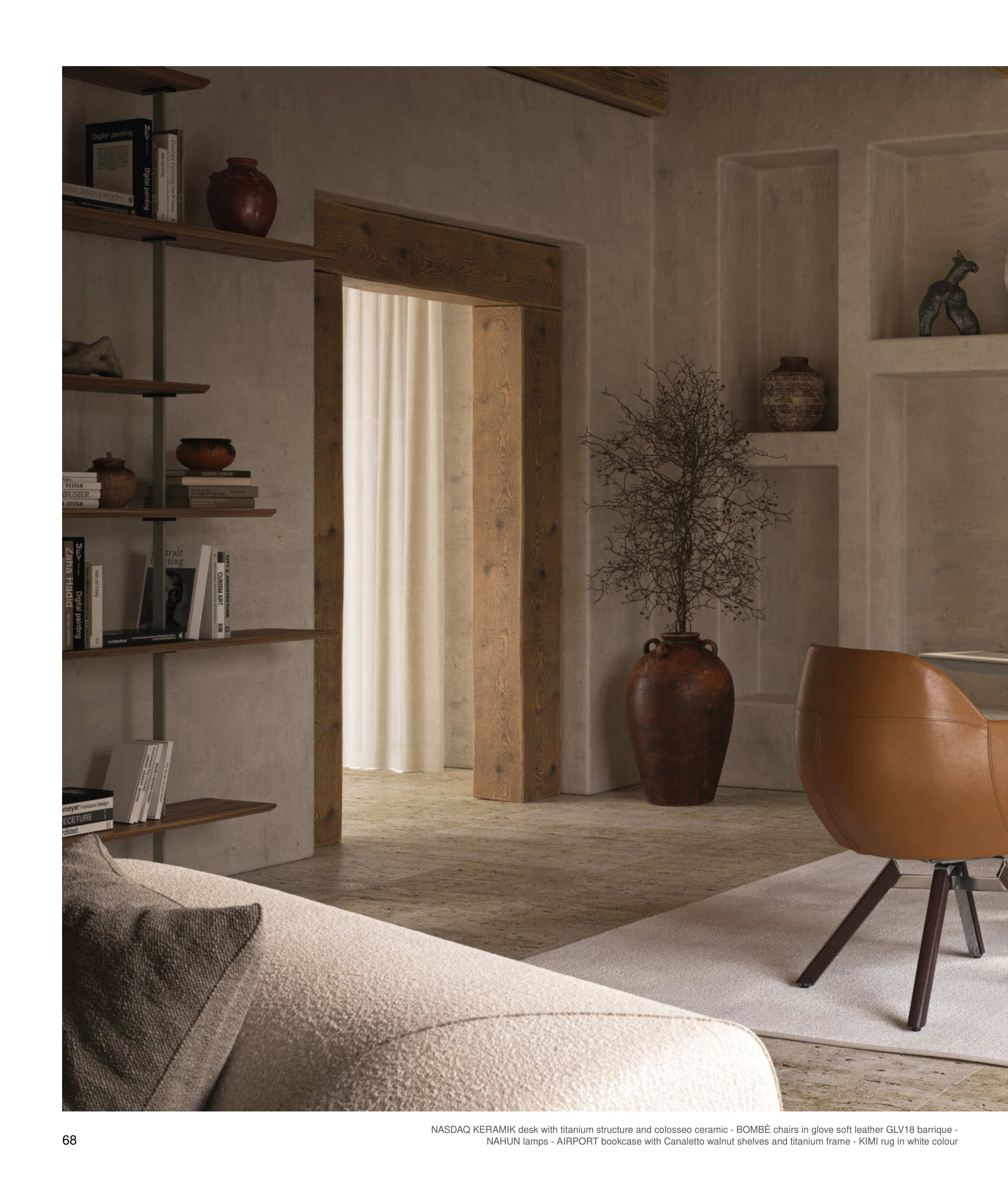 68 NASDAQ KERAMIK desk with titanium structure and colosseo ceramic - BOMBÈ chairs in glove soft leather GLV18 barrique - NAHUN lamps - AIRPORT bookcase with Canaletto walnut shelves and titanium frame - KIMI rug in white colour
