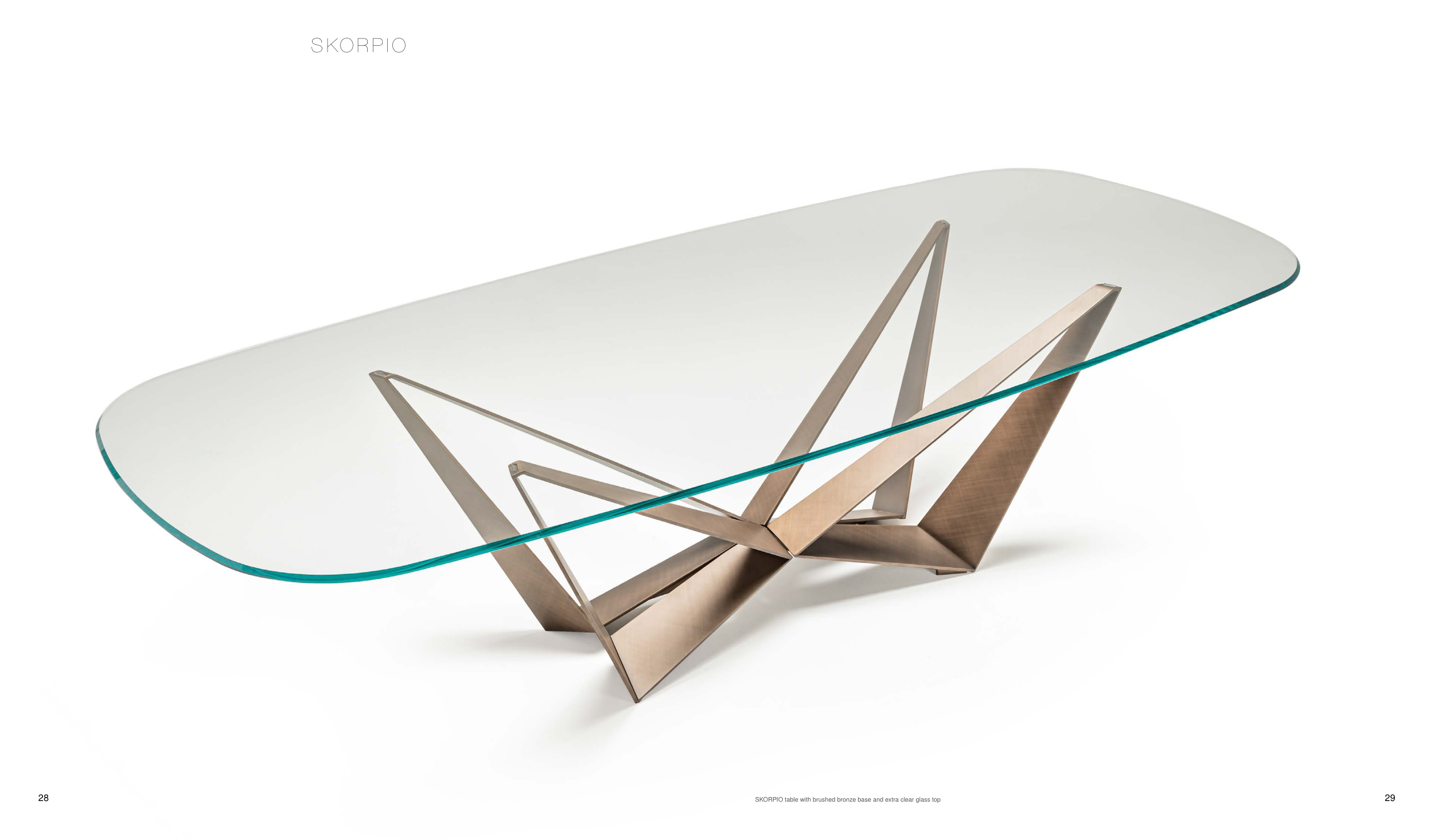 SKORPIO table with brushed bronze base and extra clear glass top