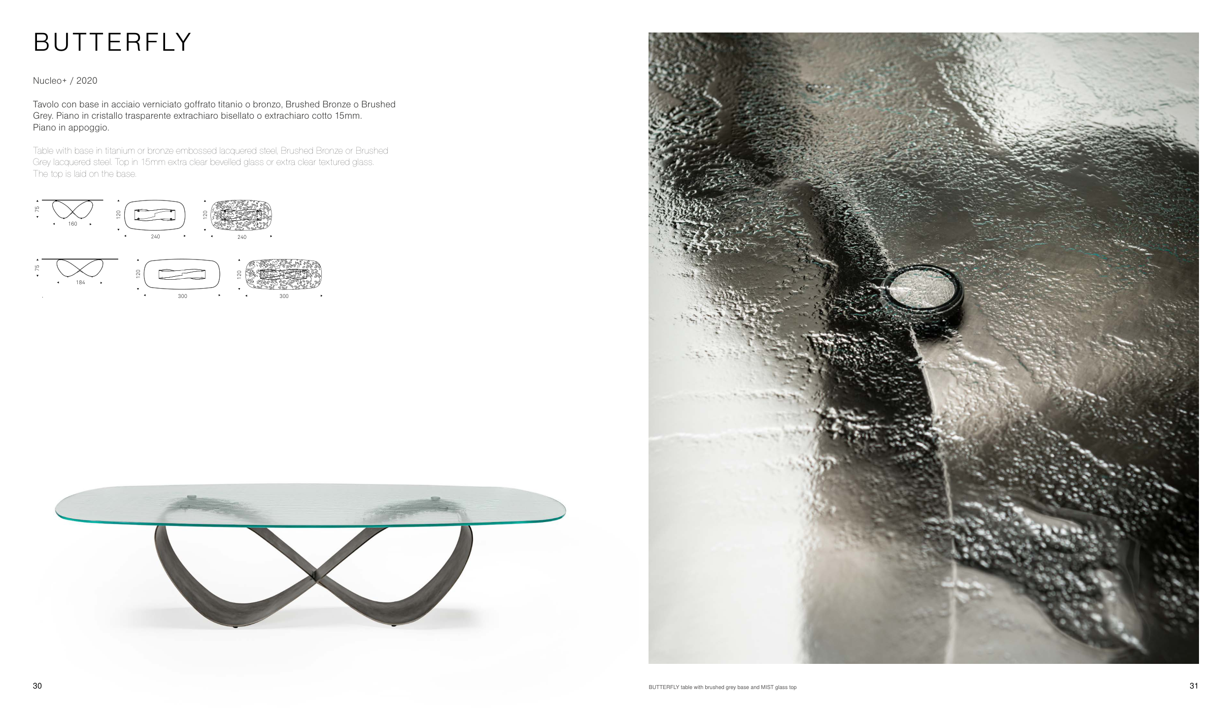 BUTTERFLY table with brushed grey base and MIST glass top