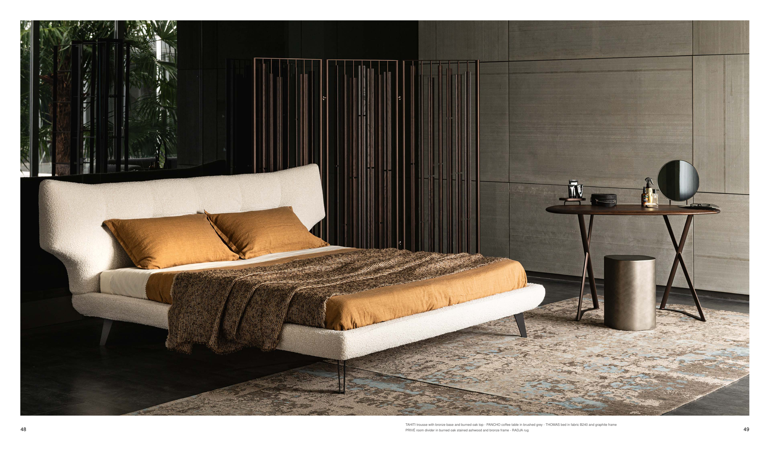 TAHITI trousse with bronze base and burned oak top - PANCHO coffee table in brushed grey - THOMAS bed in fabric B240 and graphite frame PRIVÉ room divider in burned oak stained ashwood and bronze frame - RADJA rug 48 49