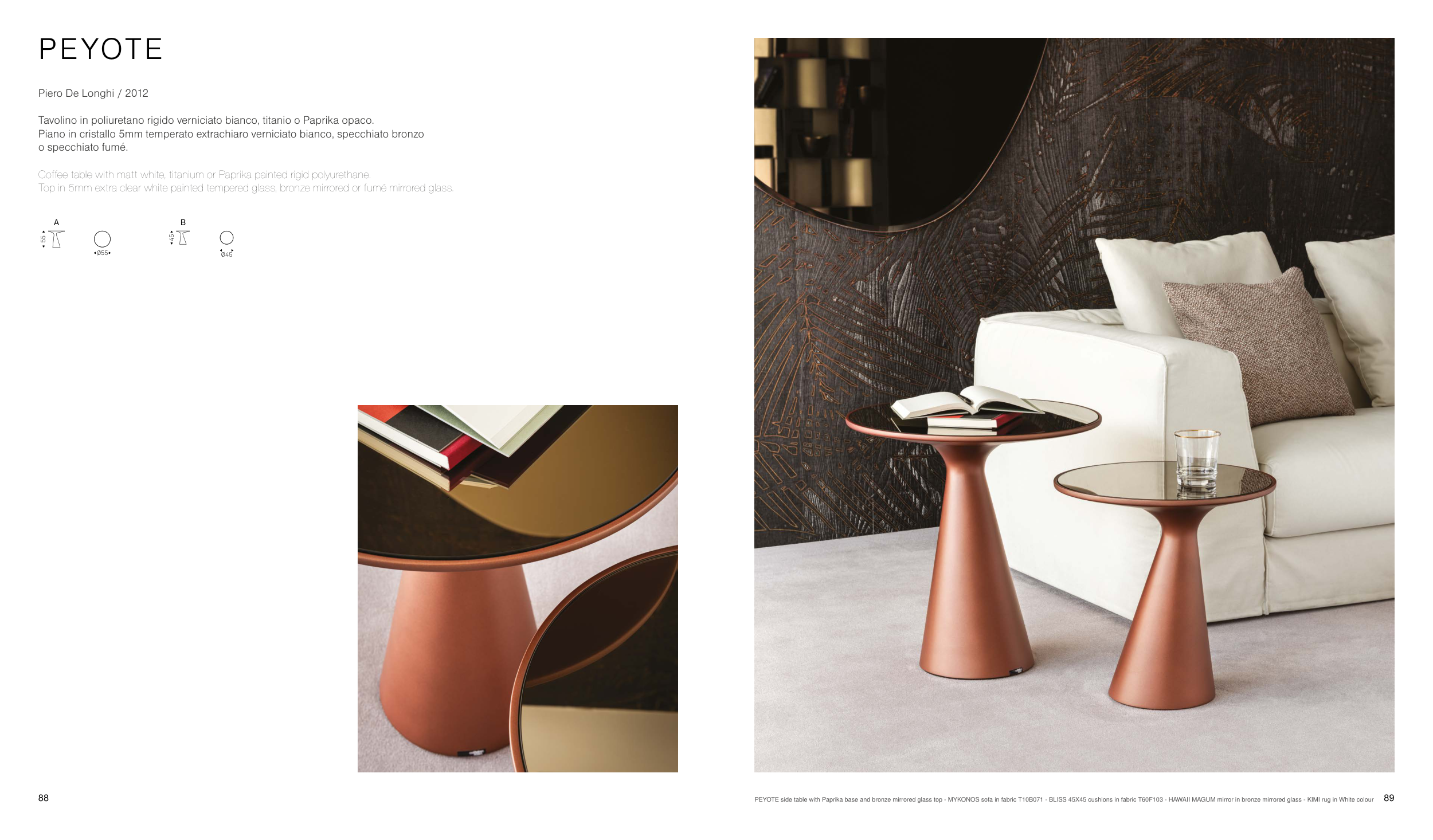 PEYOTE side table with Paprika base and bronze mirrored glass top - MYKONOS sofa in fabric T10B071 - BLISS 45X45 cushions in fabric T60F103 - HAWAII MAGUM mirror in bronze mirrored glass - KIMI rug in White colour