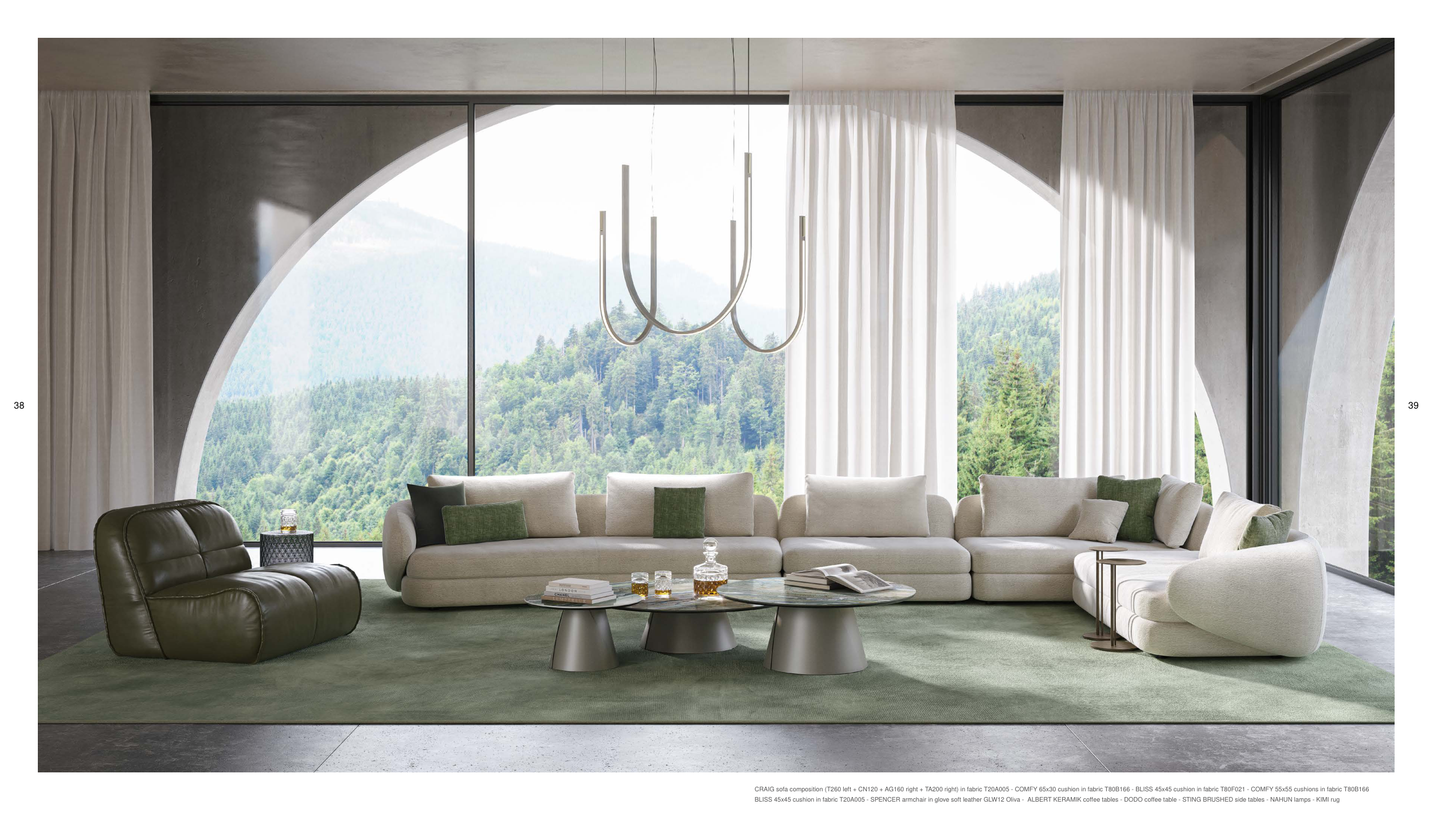 BLISS 45x45 cushion in fabric T20A005 - SPENCER armchair in glove soft leather GLW12 Oliva - ALBERT KERAMIK coffee tables - DODO coffee table - STING BRUSHED side tables - NAHUN lamps - KIMI rug