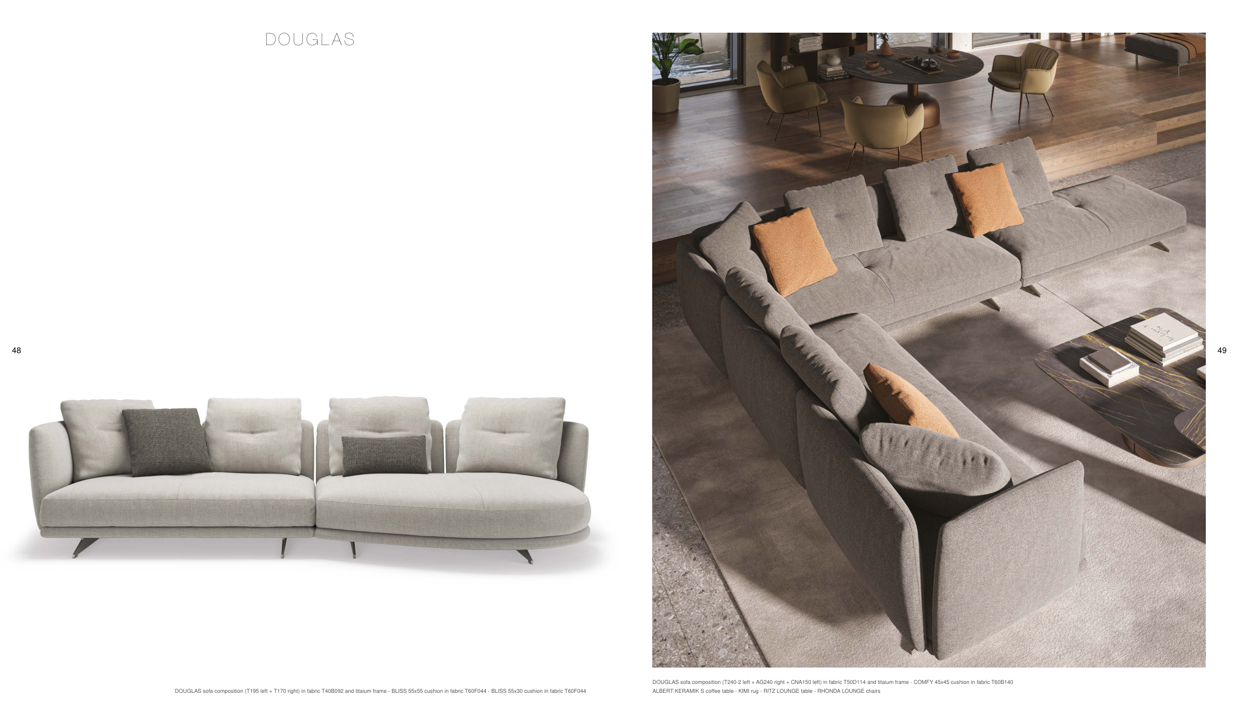 DOUGLAS sofa composition (T195 left + T170 right) in fabric T40B092 and titaium frame - BLISS 55x55 cushion in fabric T60F044 - BLISS 55x30 cushion in fabric T60F044