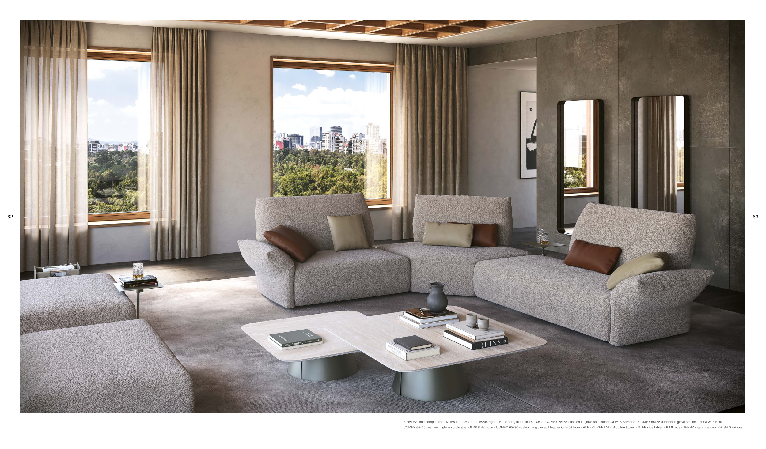 COMFY 65x30 cushion in glove soft leather GLW18 Barrique - COMFY 65x30 cushion in glove soft leather GLW03 Ecrù - ALBERT KERAMIK S coffee tables - STEP side tables - KIMI rugs - JERRY magazine rack - WISH S mirrors