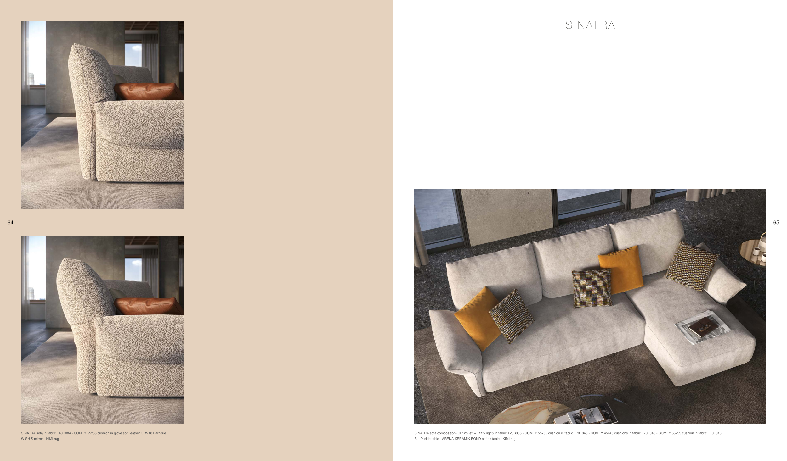 SINATRA sofa composition (CL125 left + T225 right) in fabric T20B055 - COMFY 55x55 cushion in fabric T70F045 - COMFY 45x45 cushions in fabric T70F045 - COMFY 55x55 cushion in fabric T70F013