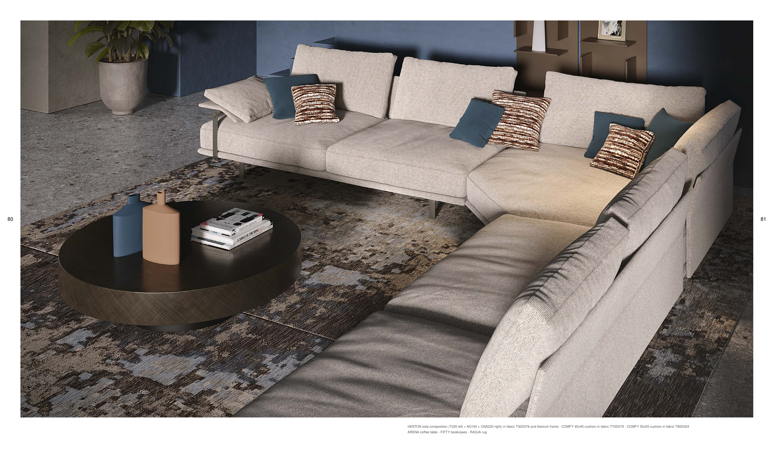 HESTON sofa composition (T220 left + AG150 + CNA220 right) in fabric T30D076 and titanium frame - COMFY 45x45 cushion in fabric T70D079 - COMFY 55x55 cushion in fabric T80D024