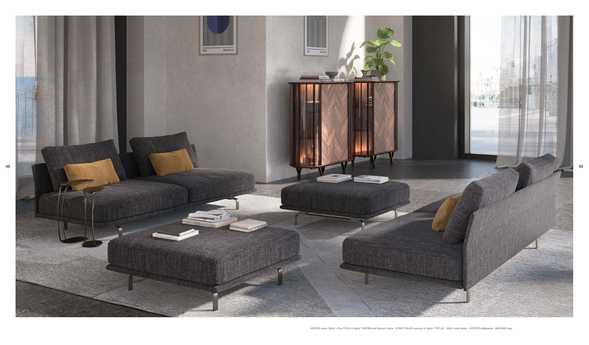 HAYDEN sofas (S240 + Pouf P100) in fabric T50F090 and titanium frame - COMFY 65x30 cushions in fabric T70F122 - YAGO side tables - COSTES sideboards - MADRAS rugs