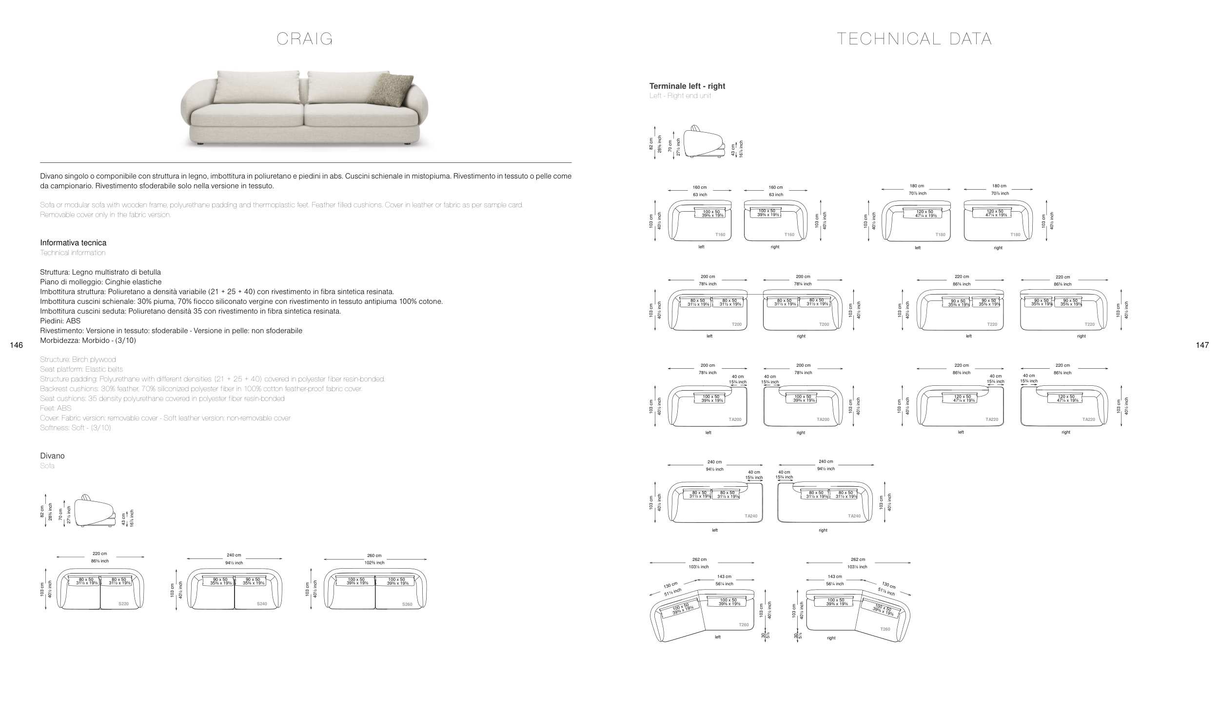 Divano singolo o componibile con struttura in legno, imbottitura in poliuretano e piedini in abs. Cuscini schienale in mistopiuma. Rivestimento in tessuto o pelle come