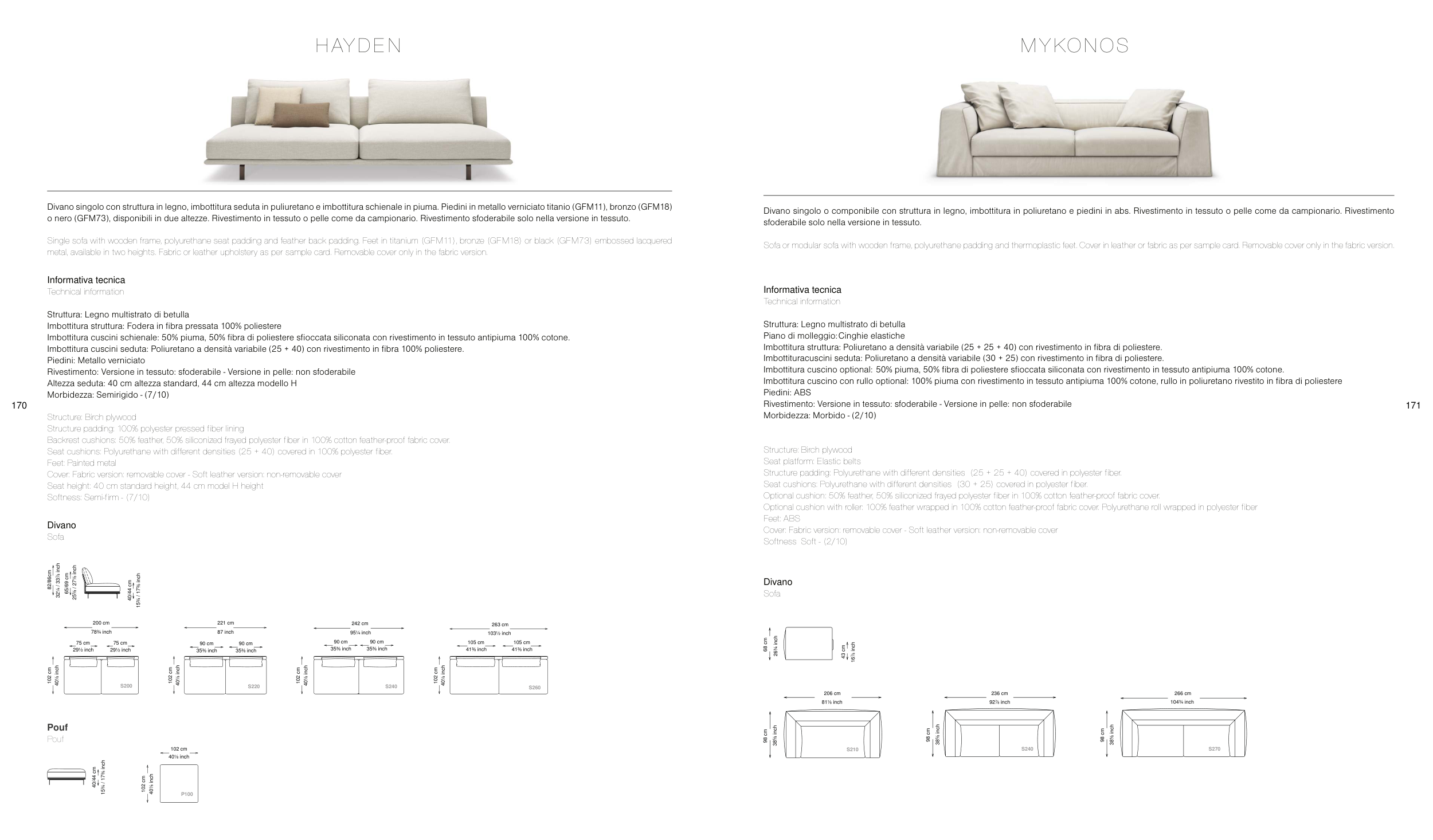 Sofa or modular sofa with wooden frame, polyurethane padding and thermoplastic feet. Cover in leather or fabric as per sample card. Removable cover only in the fabric version.