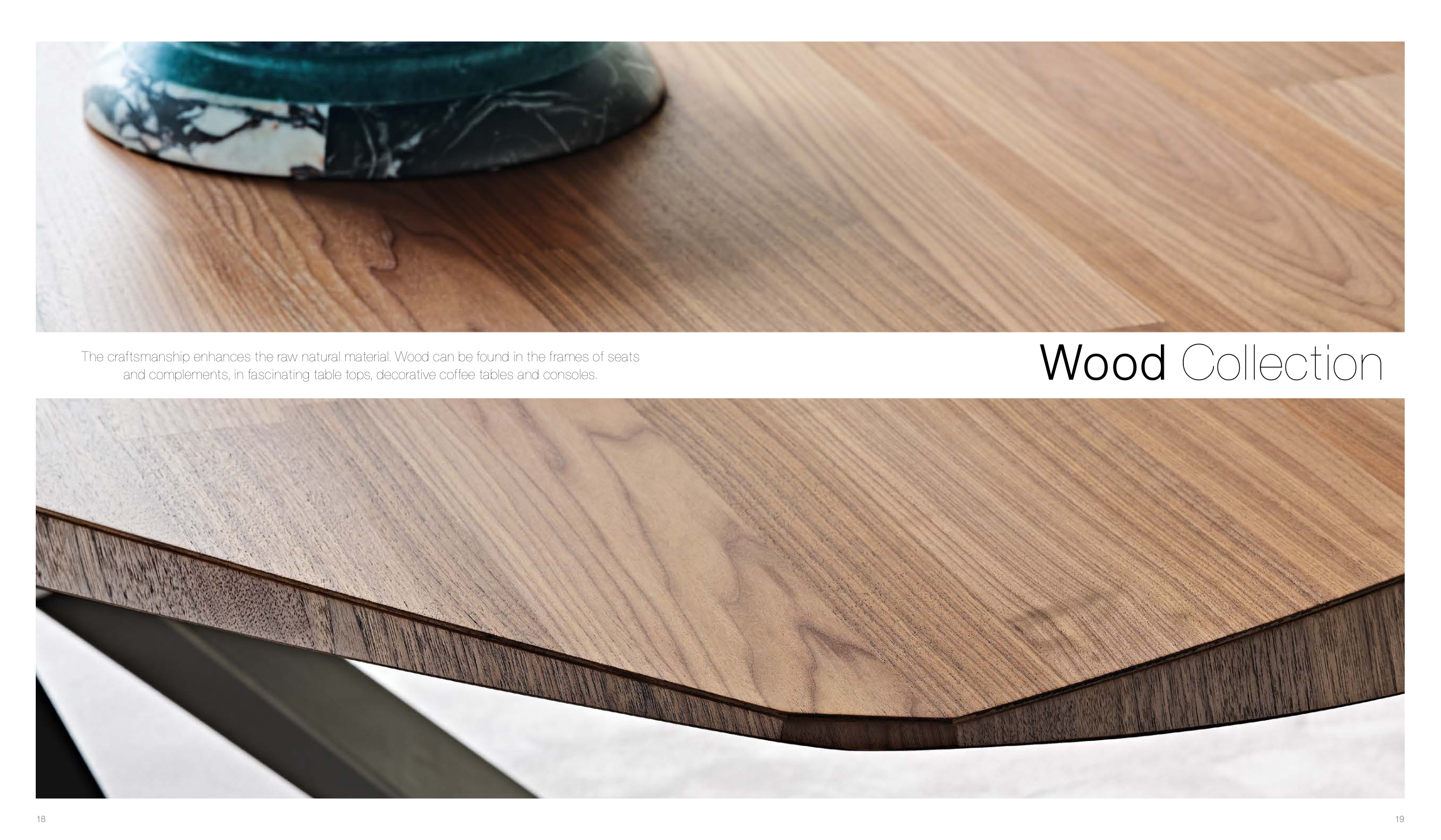 19 18 Wood Collection The craftsmanship enhances the raw natural material. Wood can be found in the frames of seats and complements, in fascinating table tops, decorative coffee tables and consoles.