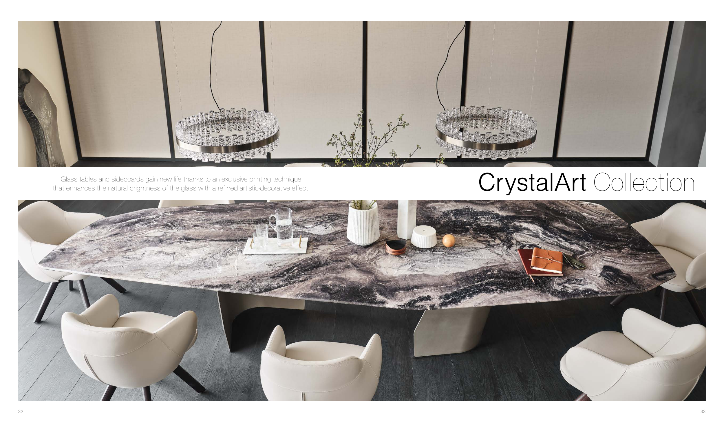 33 32 CrystalArt Collection Glass tables and sideboards gain new life thanks to an exclusive printing technique that enhances the natural brightness of the glass with a refined artistic-decorative effect.