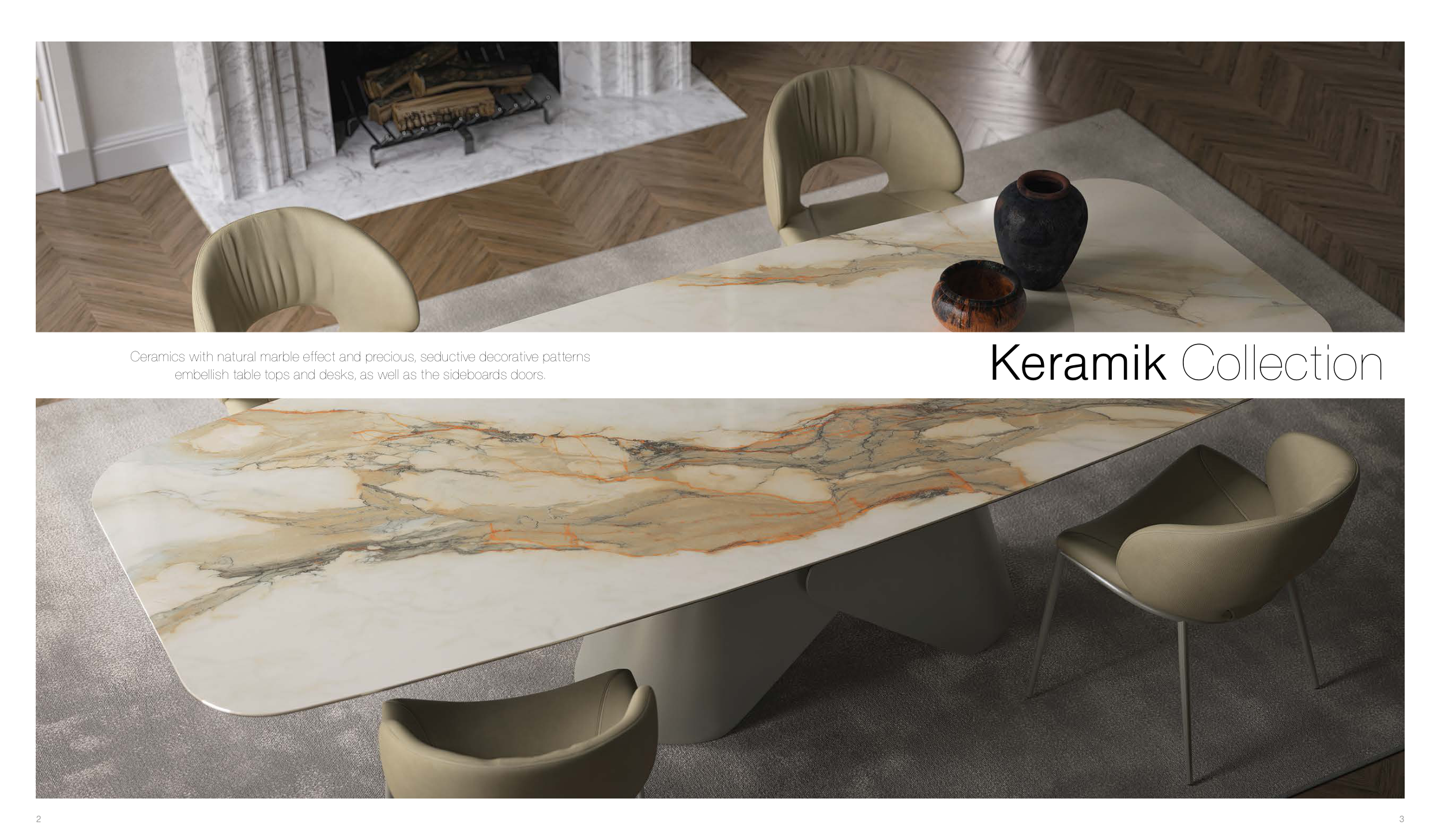 3 2 Keramik Collection Ceramics with natural marble effect and precious, seductive decorative patterns embellish table tops and desks, as well as the sideboards doors.