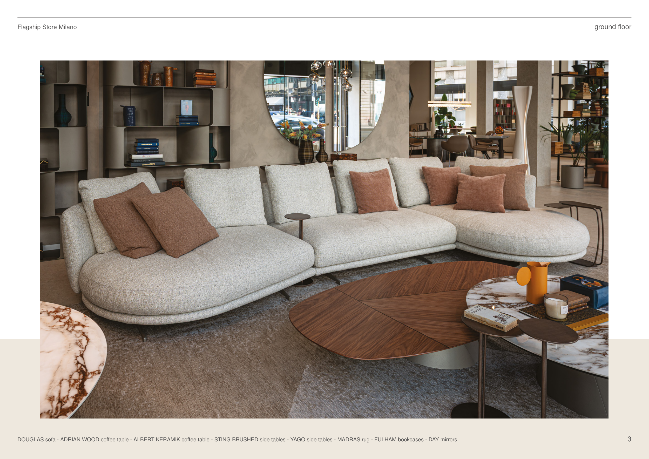 Flagship Store Milano ground floor DOUGLAS sofa - ADRIAN WOOD coffee table - ALBERT KERAMIK coffee table - STING BRUSHED side tables - YAGO side tables - MADRAS rug - FULHAM bookcases - DAY mirrors 3