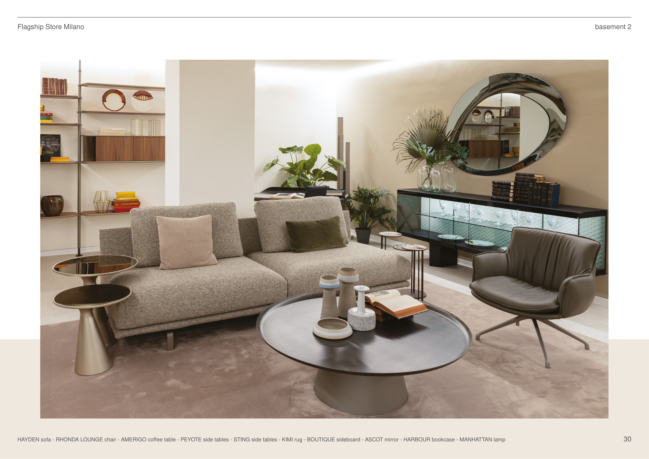 HAYDEN sofa - RHONDA LOUNGE chair - AMERIGO coffee table - PEYOTE side tables - STING side tables - KIMI rug - BOUTIQUE sideboard - ASCOT mirror - HARBOUR bookcase - MANHATTAN lamp