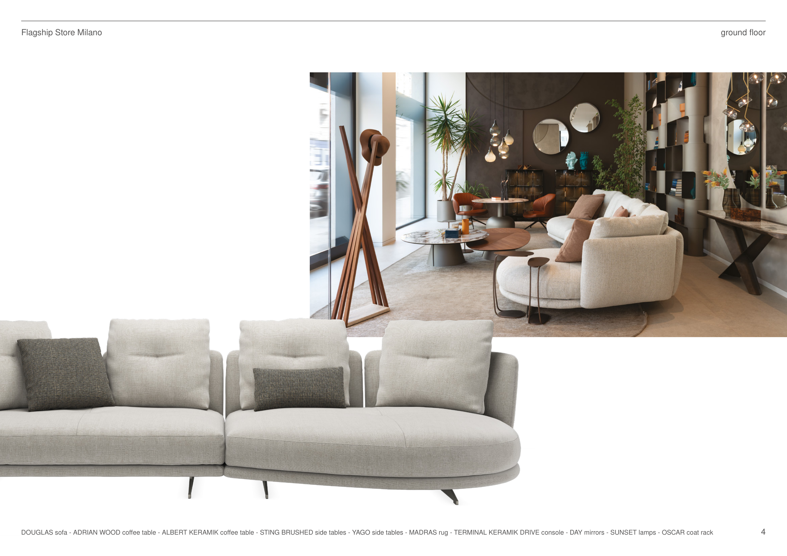 Flagship Store Milano ground floor DOUGLAS sofa - ADRIAN WOOD coffee table - ALBERT KERAMIK coffee table - STING BRUSHED side tables - YAGO side tables - MADRAS rug - TERMINAL KERAMIK DRIVE console - DAY mirrors - SUNSET lamps - OSCAR coat rack 4
