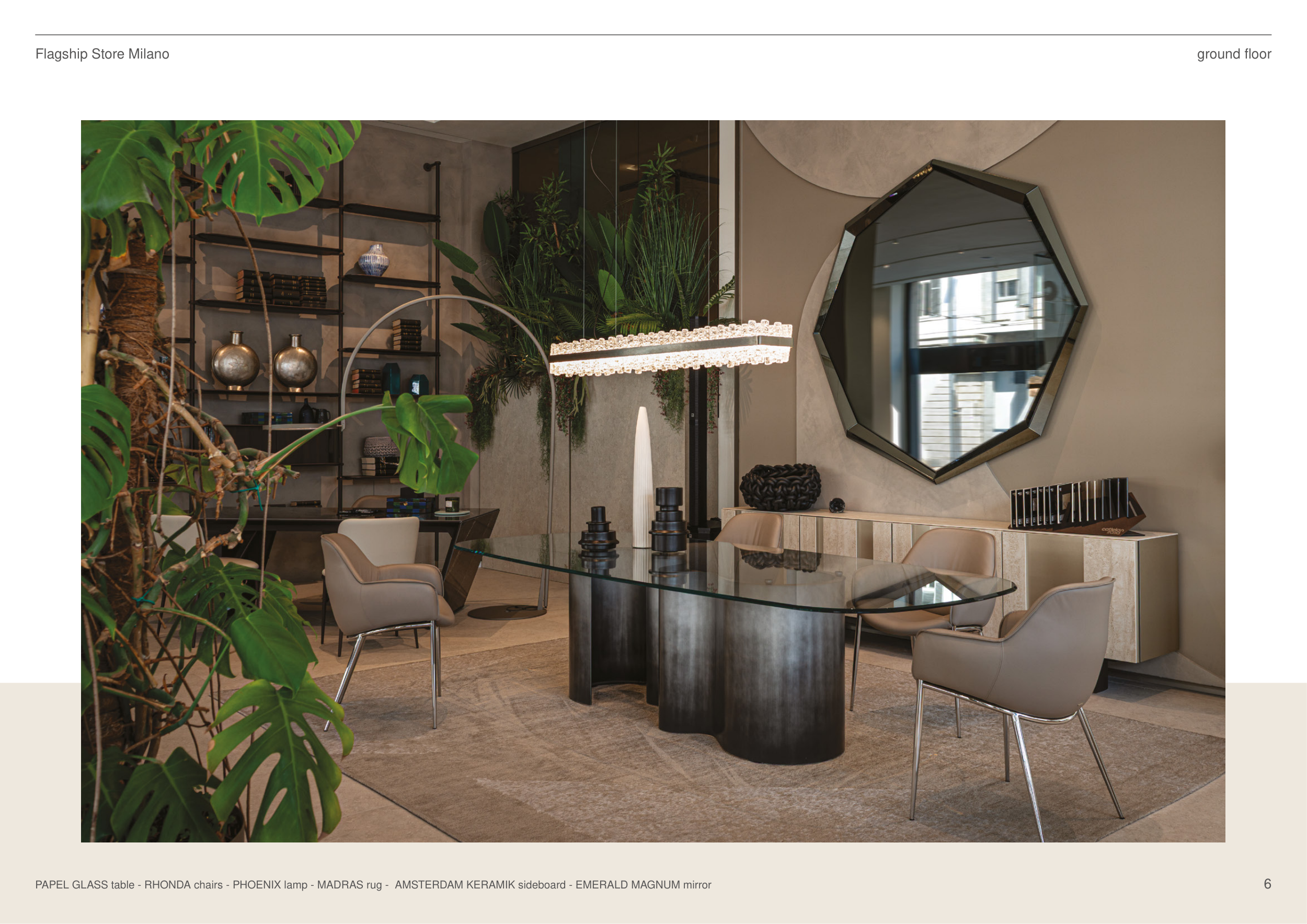 PAPEL GLASS table - RHONDA chairs - PHOENIX lamp - MADRAS rug - AMSTERDAM KERAMIK sideboard - EMERALD MAGNUM mirror