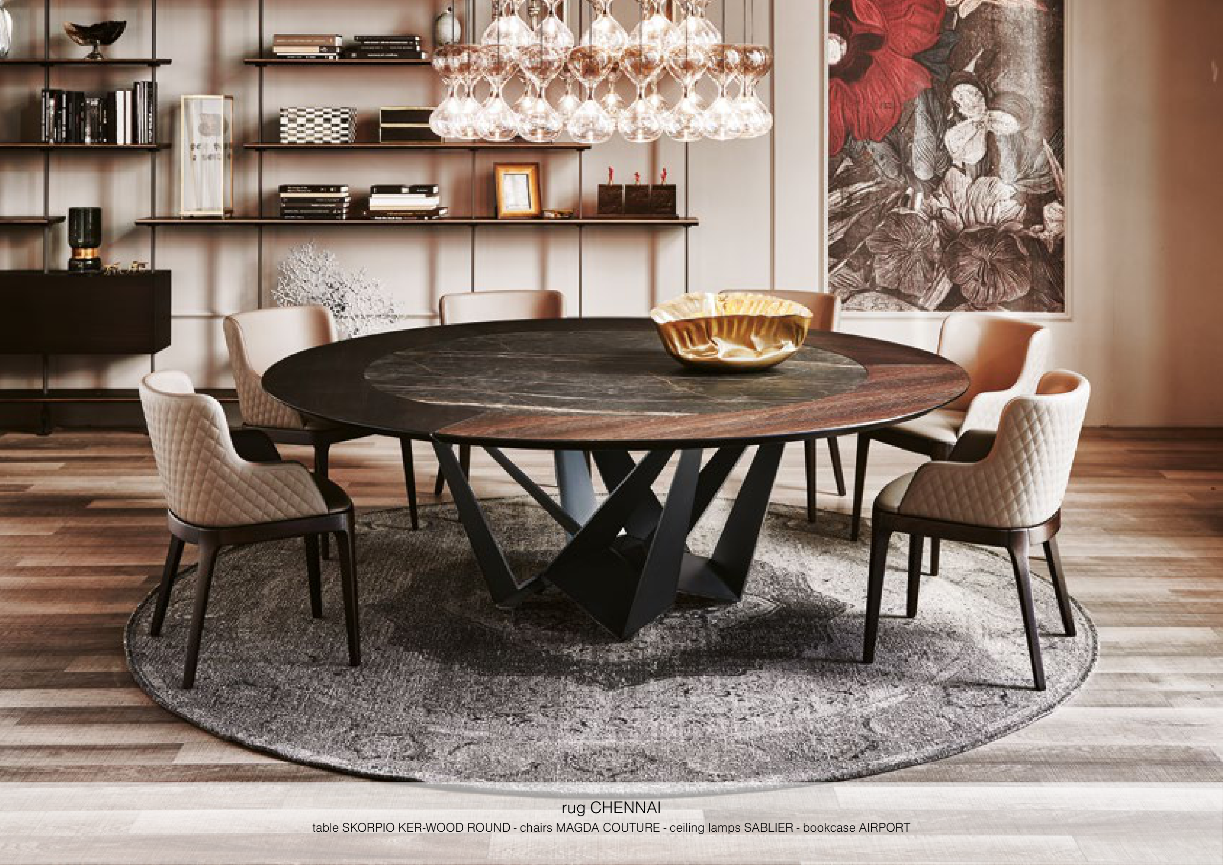 table SKORPIO KER-WOOD ROUND - chairs MAGDA COUTURE - ceiling lamps SABLIER - bookcase AIRPORT