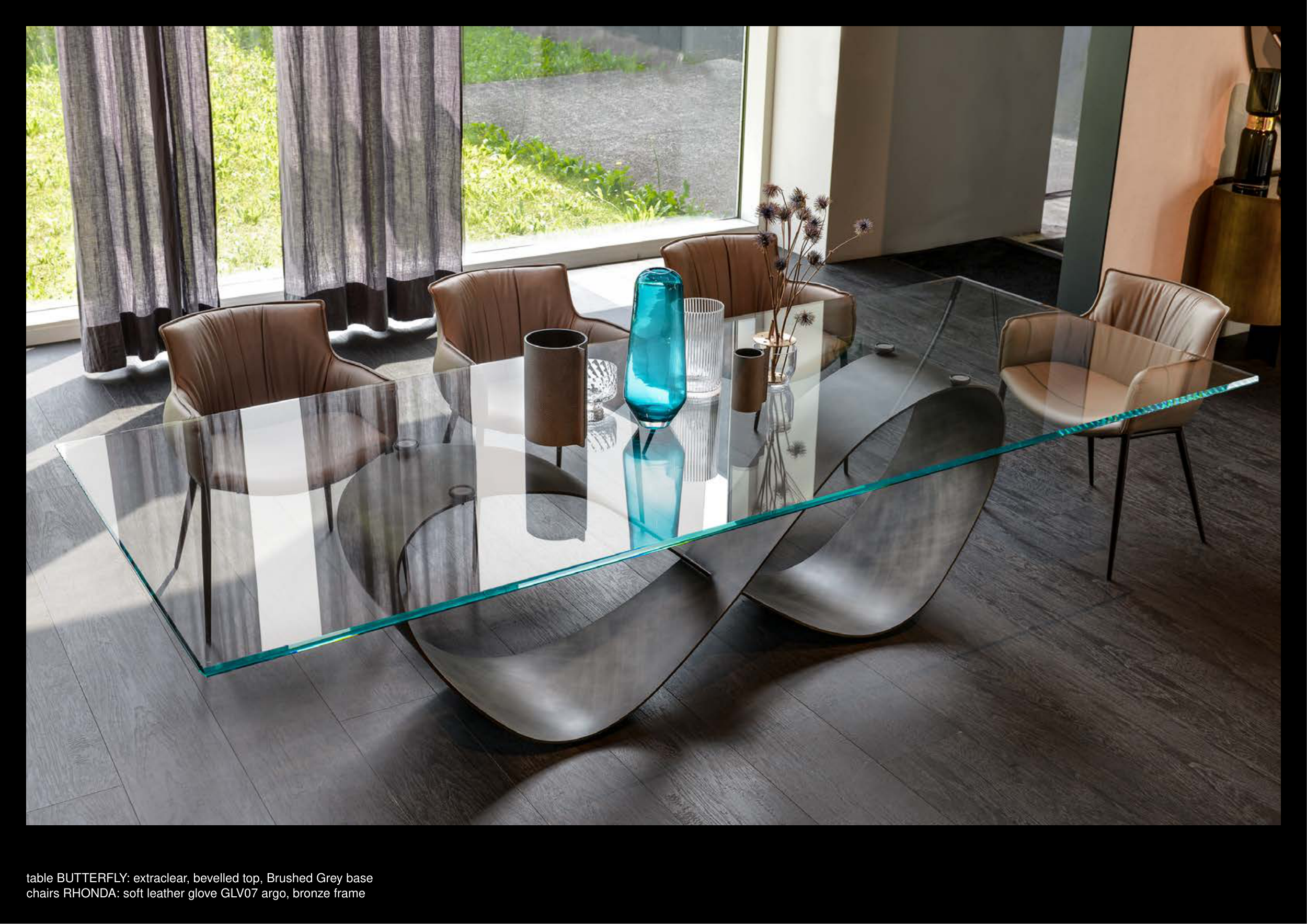 table BUTTERFLY: extraclear, bevelled top, Brushed Grey base