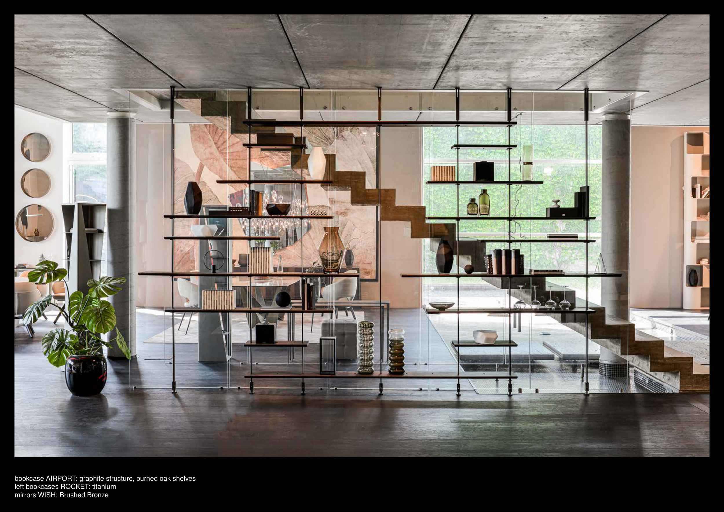 bookcase AIRPORT: graphite structure, burned oak shelves