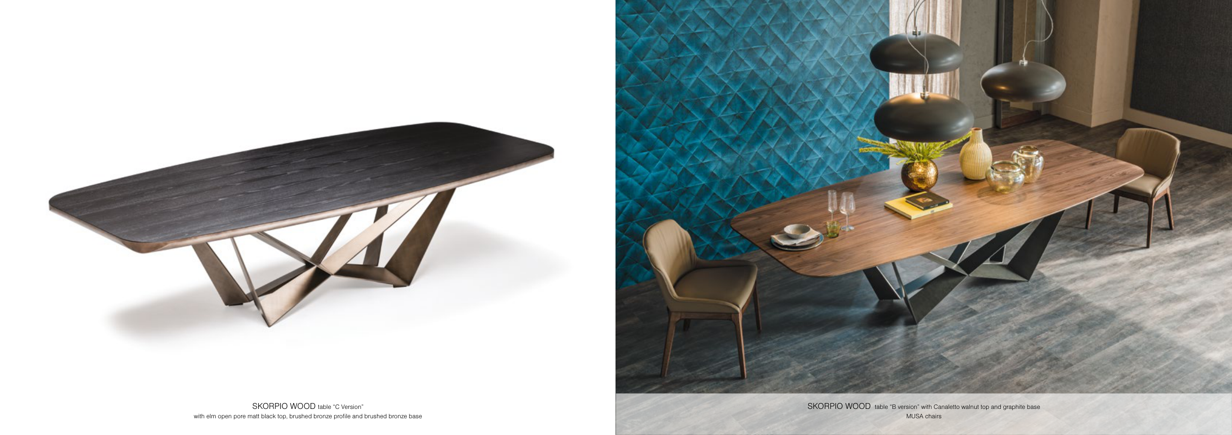 SKORPIO WOOD table “C Version” with elm open pore matt black top, brushed bronze profile and brushed bronze base SKORPIO WOOD table “B version” with Canaletto walnut top and graphite base MUSA chairs