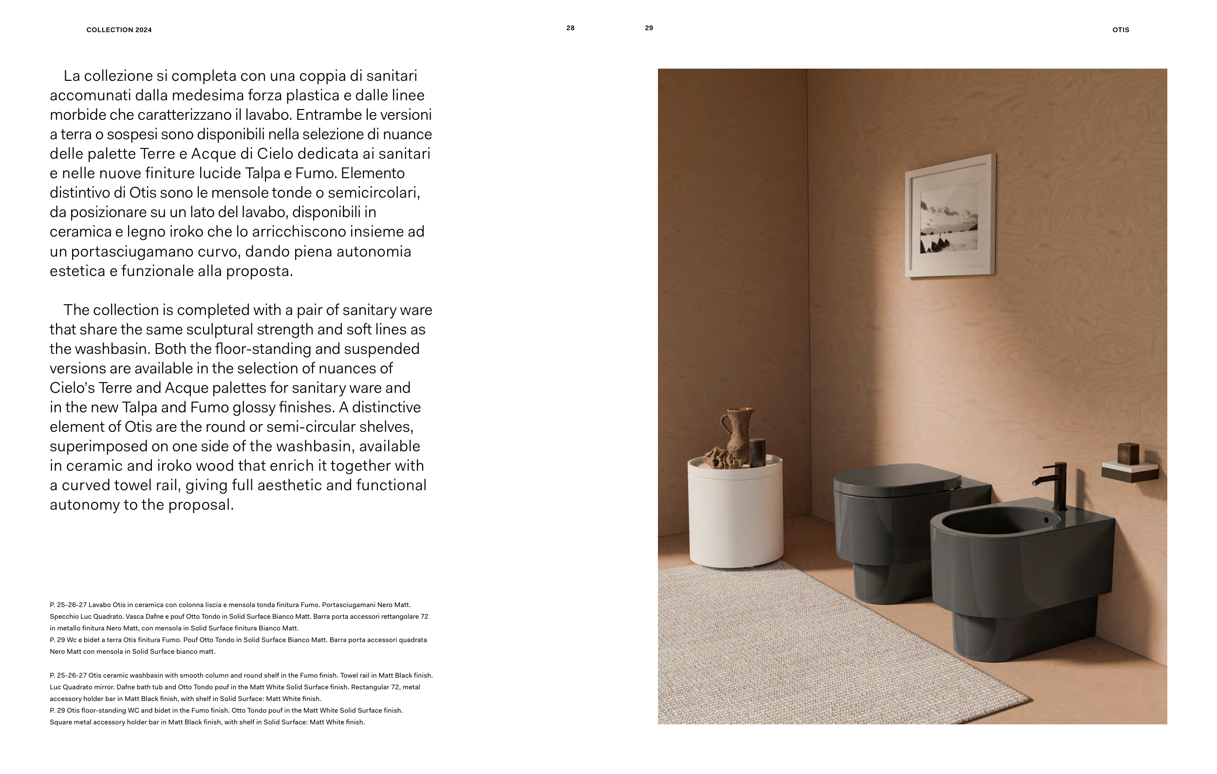 P. 29 Otis floor-standing WC and bidet in the Fumo finish. Otto Tondo pouf in the Matt White Solid Surface finish.
