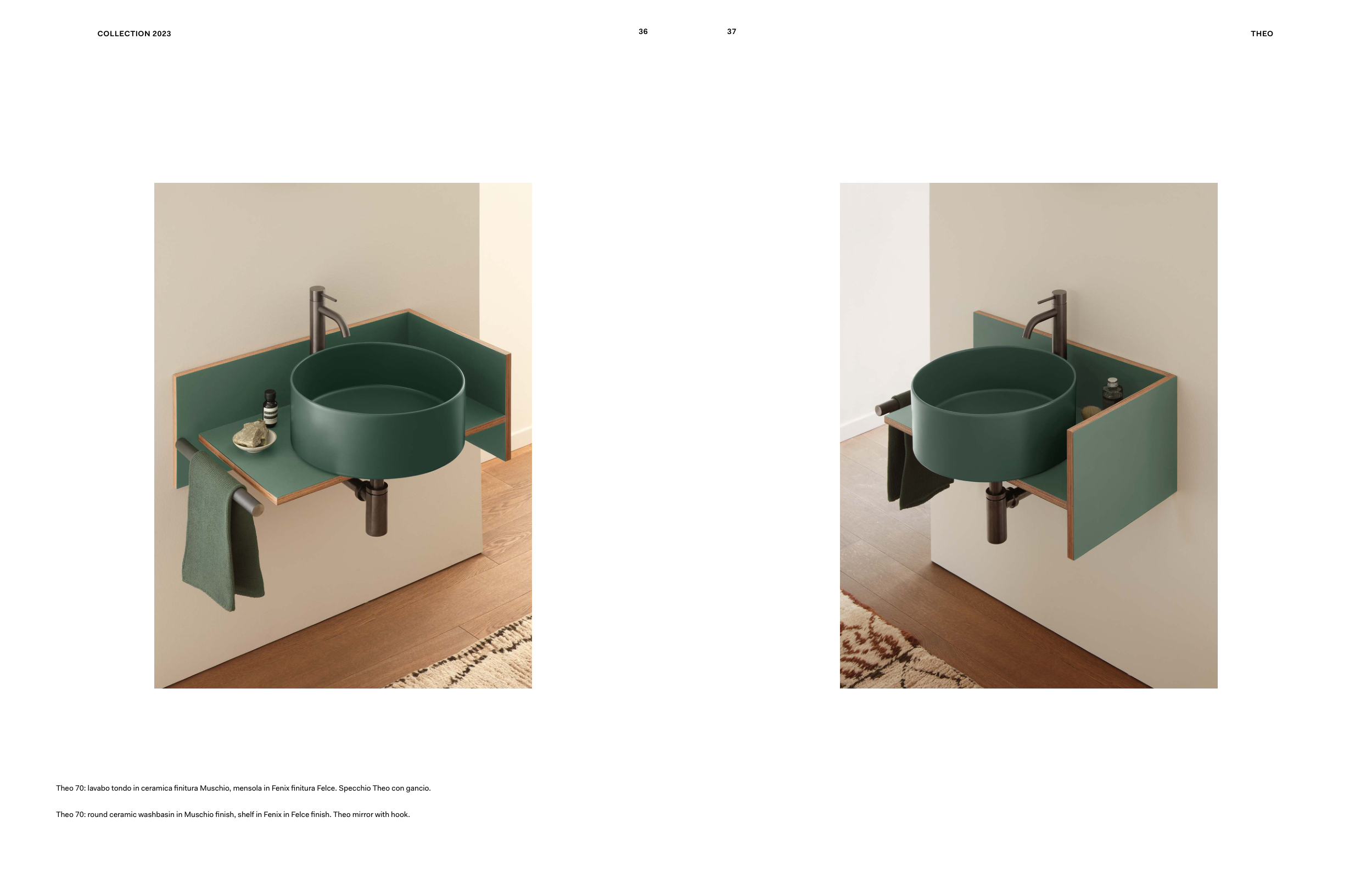 THEO 36 37 COLLECTION 2023 Theo 70: lavabo tondo in ceramica finitura Muschio, mensola in Fenix finitura Felce. Specchio Theo con gancio. Theo 70: round ceramic washbasin in Muschio finish, shelf in Fenix in Felce finish. Theo mirror with hook.