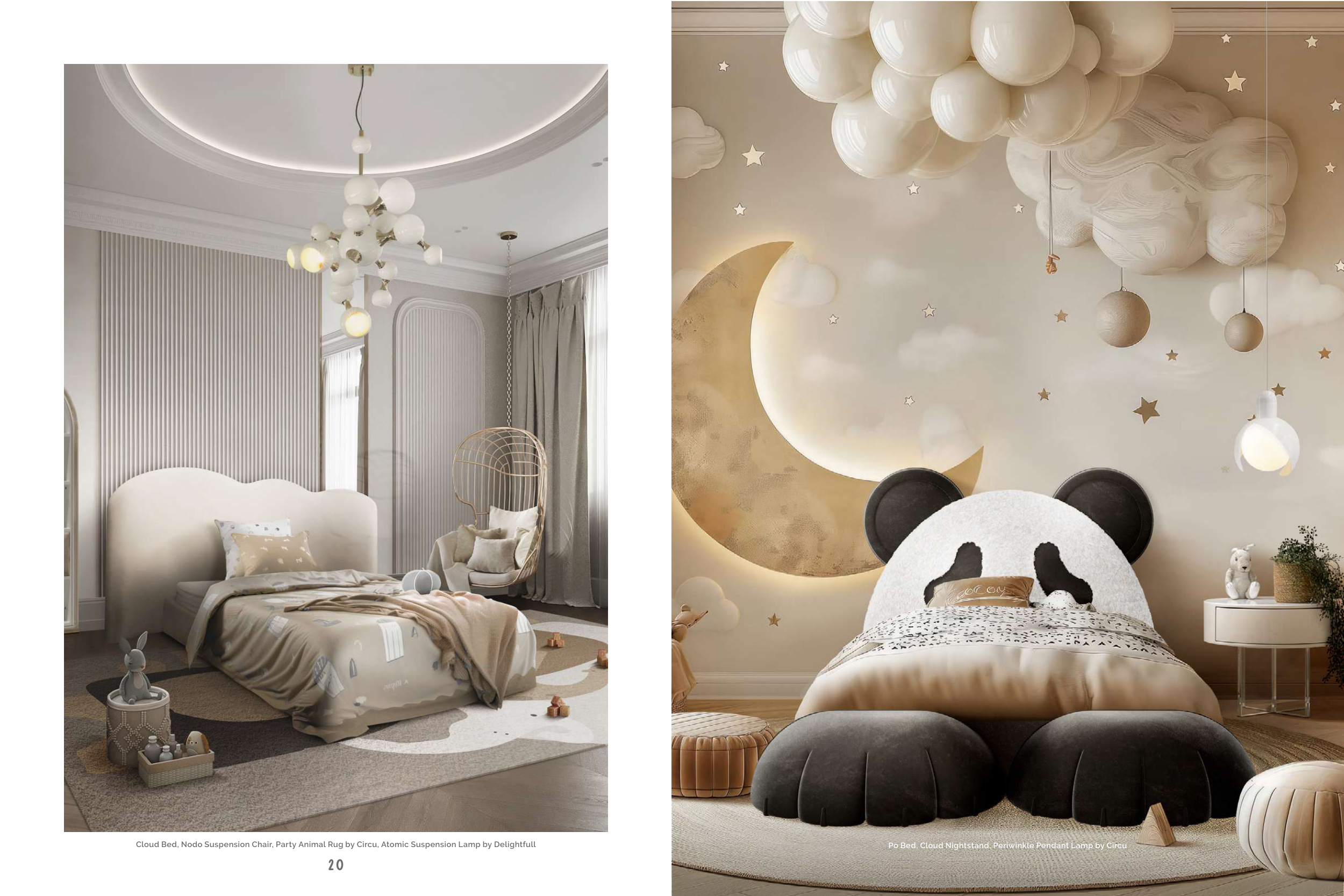 20 21 Cloud Bed, Nodo Suspension Chair, Party Animal Rug by Circu, Atomic Suspension Lamp by Delightfull Po Bed, Cloud Nightstand, Periwinkle Pendant Lamp by Circu