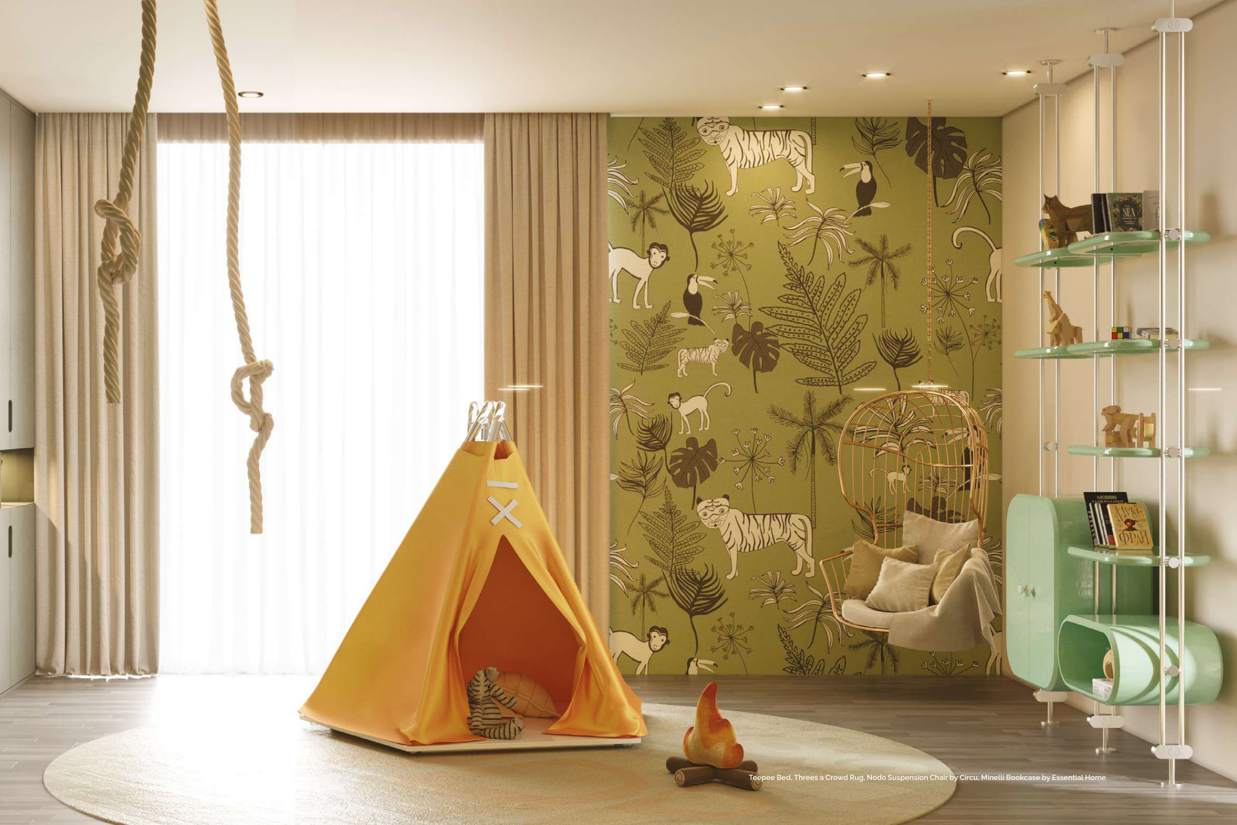 Teepee Bed, Threes a Crowd Rug, Nodo Suspension Chair by Circu, Minelli Bookcase by Essential Home
