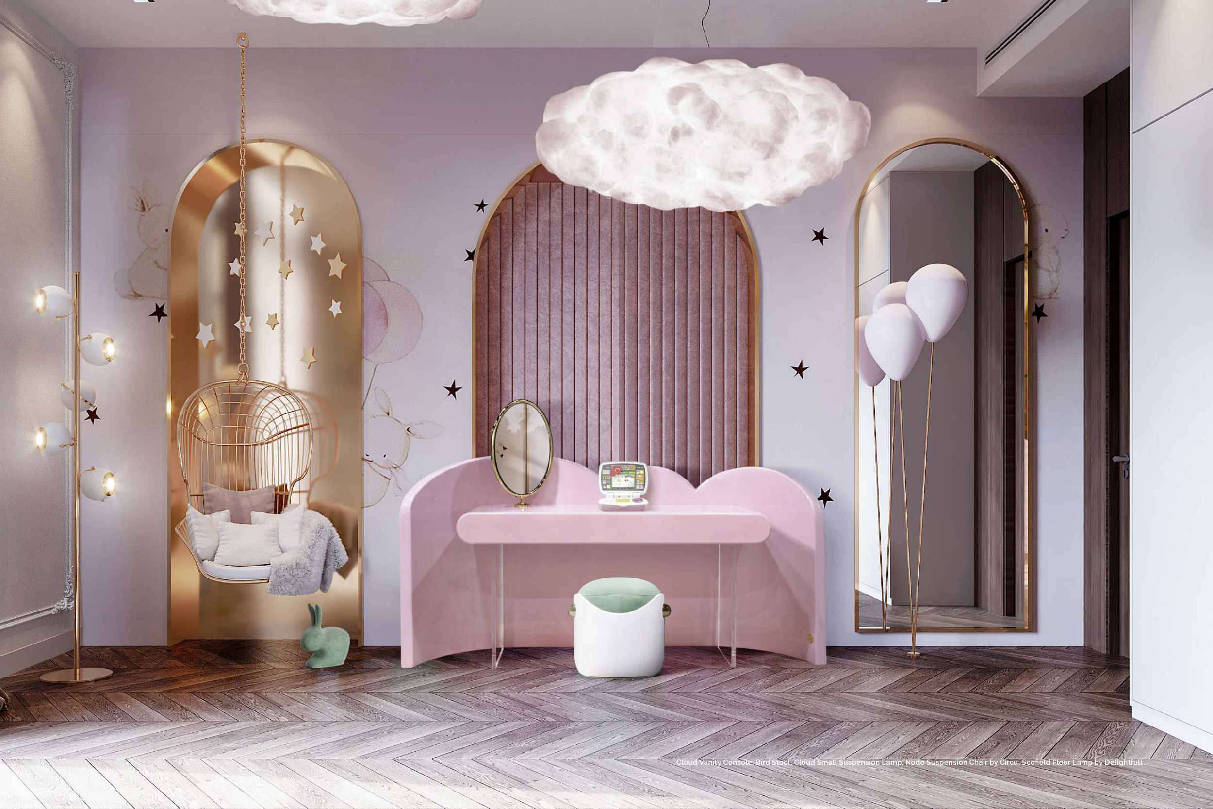Cloud Vanity Console, Bird Stool, Cloud Small Suspension Lamp, Nodo Suspension Chair by Circu, Scofield Floor Lamp by Delightfull