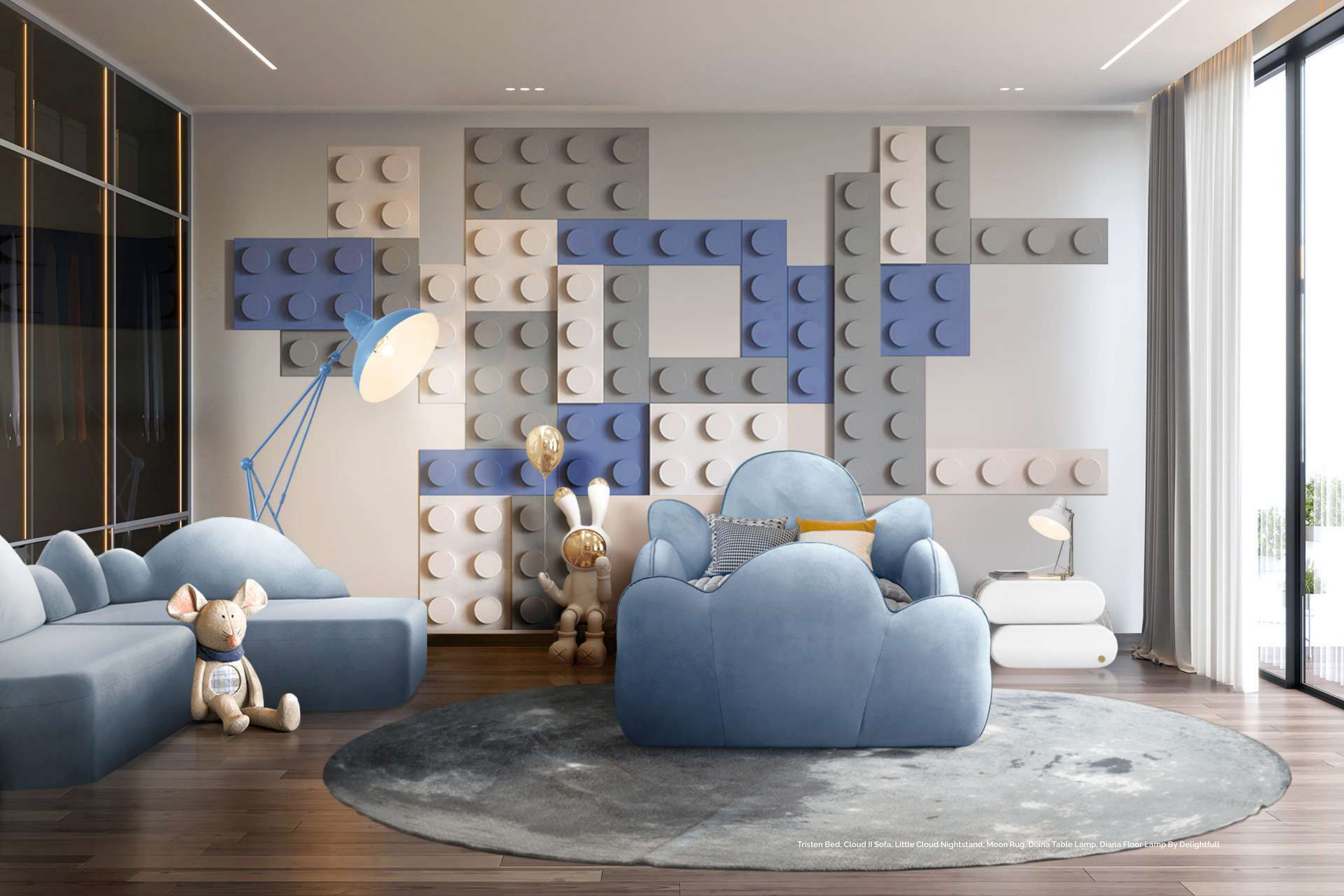Tristen Bed, Cloud II Sofa, Little Cloud Nightstand, Moon Rug, Diana Table Lamp, Diana Floor Lamp By Delightfull