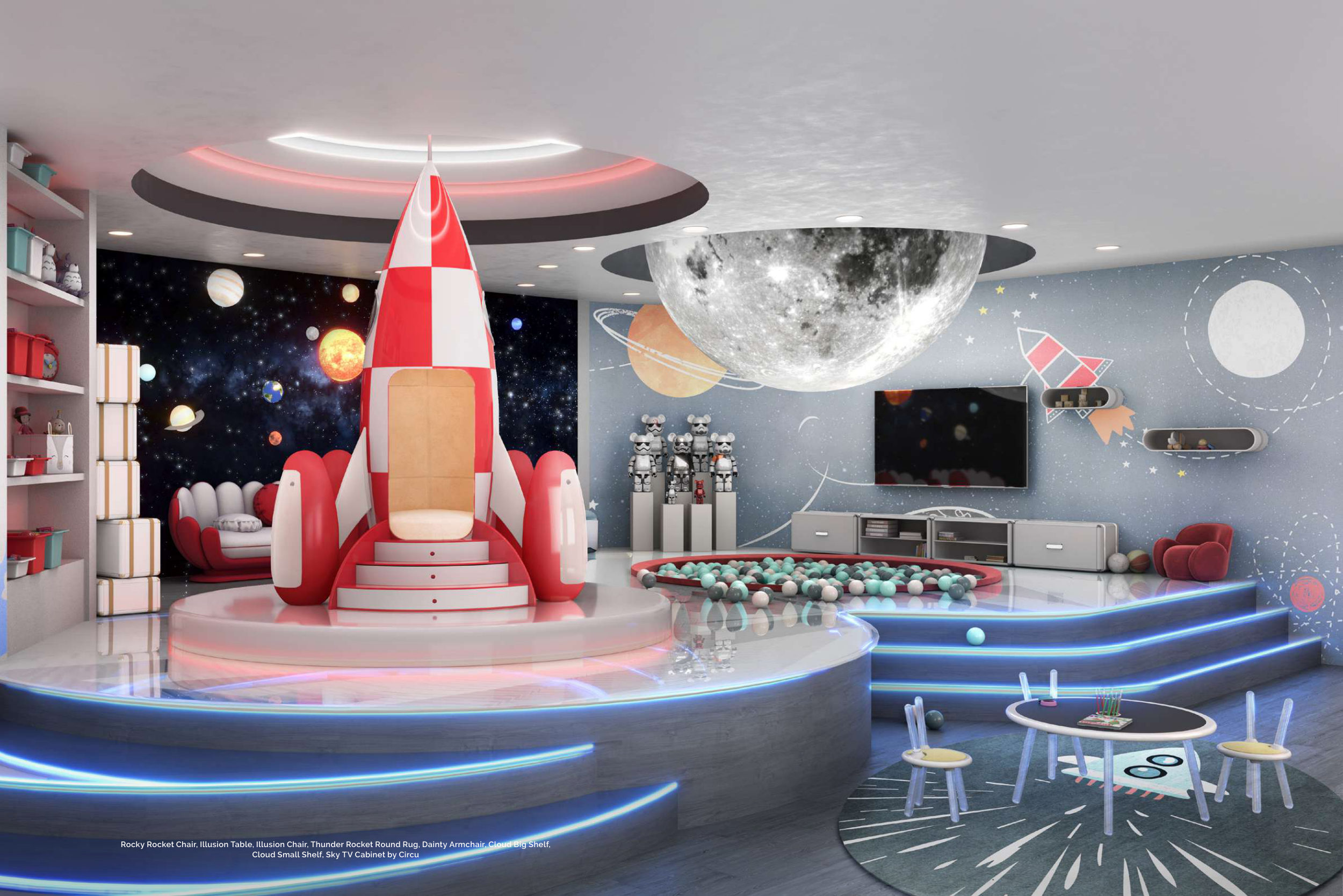 Rocky Rocket Chair, Illusion Table, Illusion Chair, Thunder Rocket Round Rug, Dainty Armchair, Cloud Big Shelf,