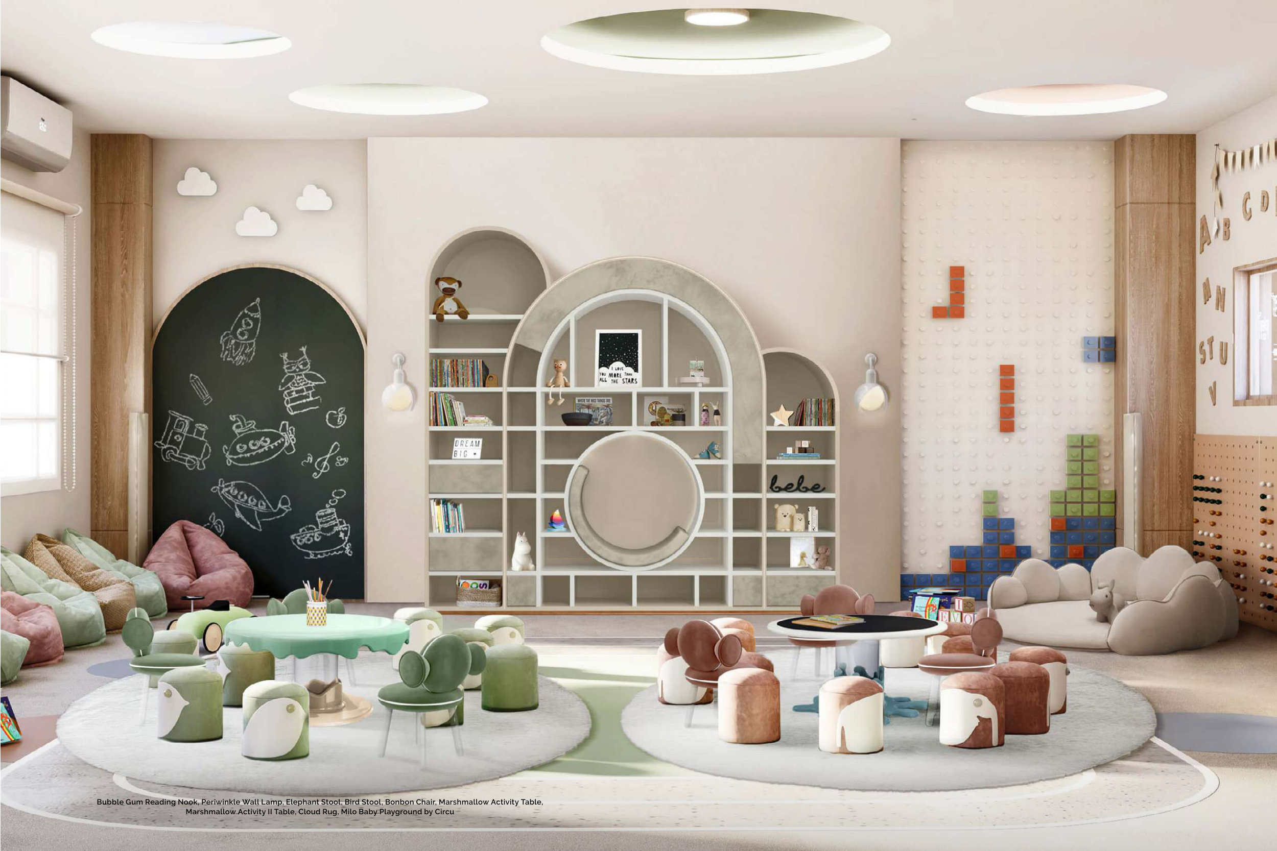 Bubble Gum Reading Nook, Periwinkle Wall Lamp, Elephant Stool, Bird Stool, Bonbon Chair, Marshmallow Activity Table,