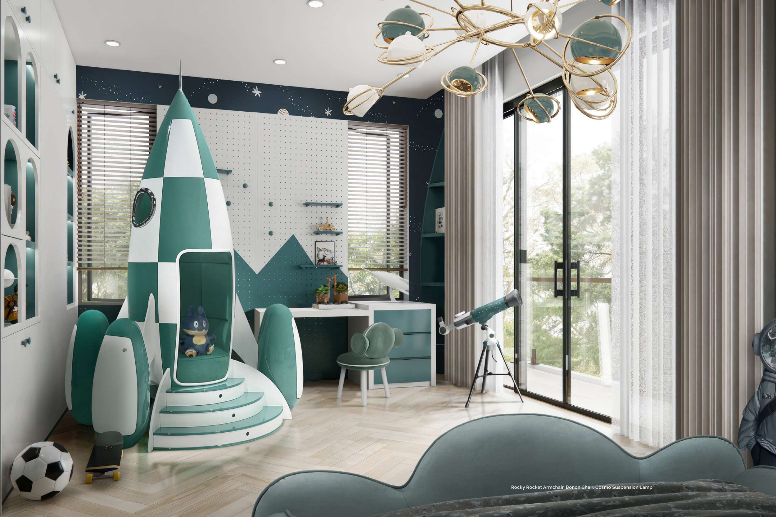 Rocky Rocket Armchair, Bonon Chair, Cosmo Suspension Lamp