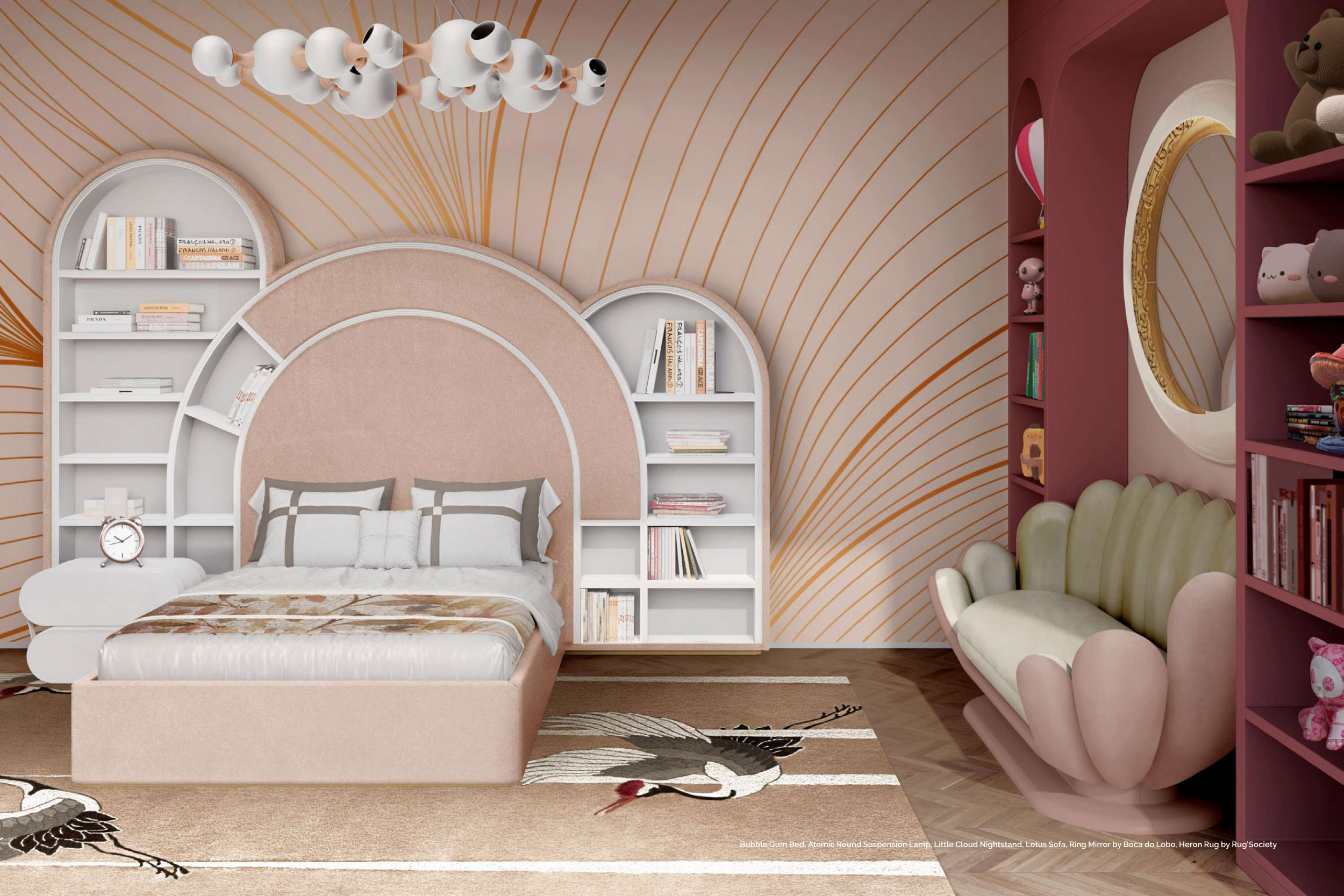Bubble Gum Bed, Atomic Round Suspension Lamp, Little Cloud Nightstand, Lotus Sofa, Ring Mirror by Boca do Lobo, Heron Rug by Rug’Society