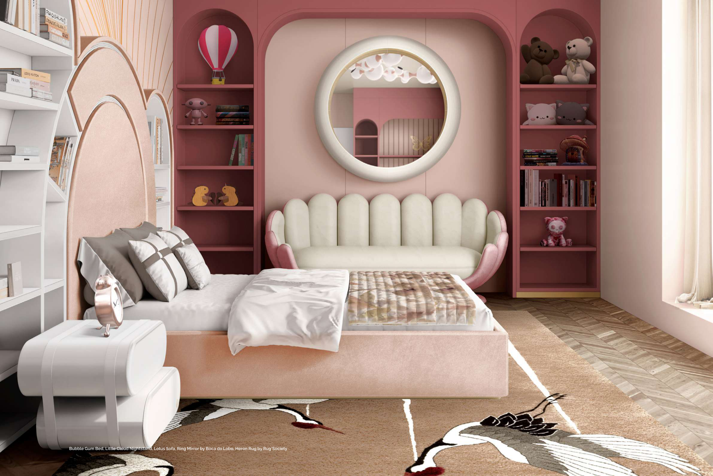 Bubble Gum Bed, Little Cloud Nightstand, Lotus Sofa, Ring Mirror by Boca do Lobo, Heron Rug by Rug’Society